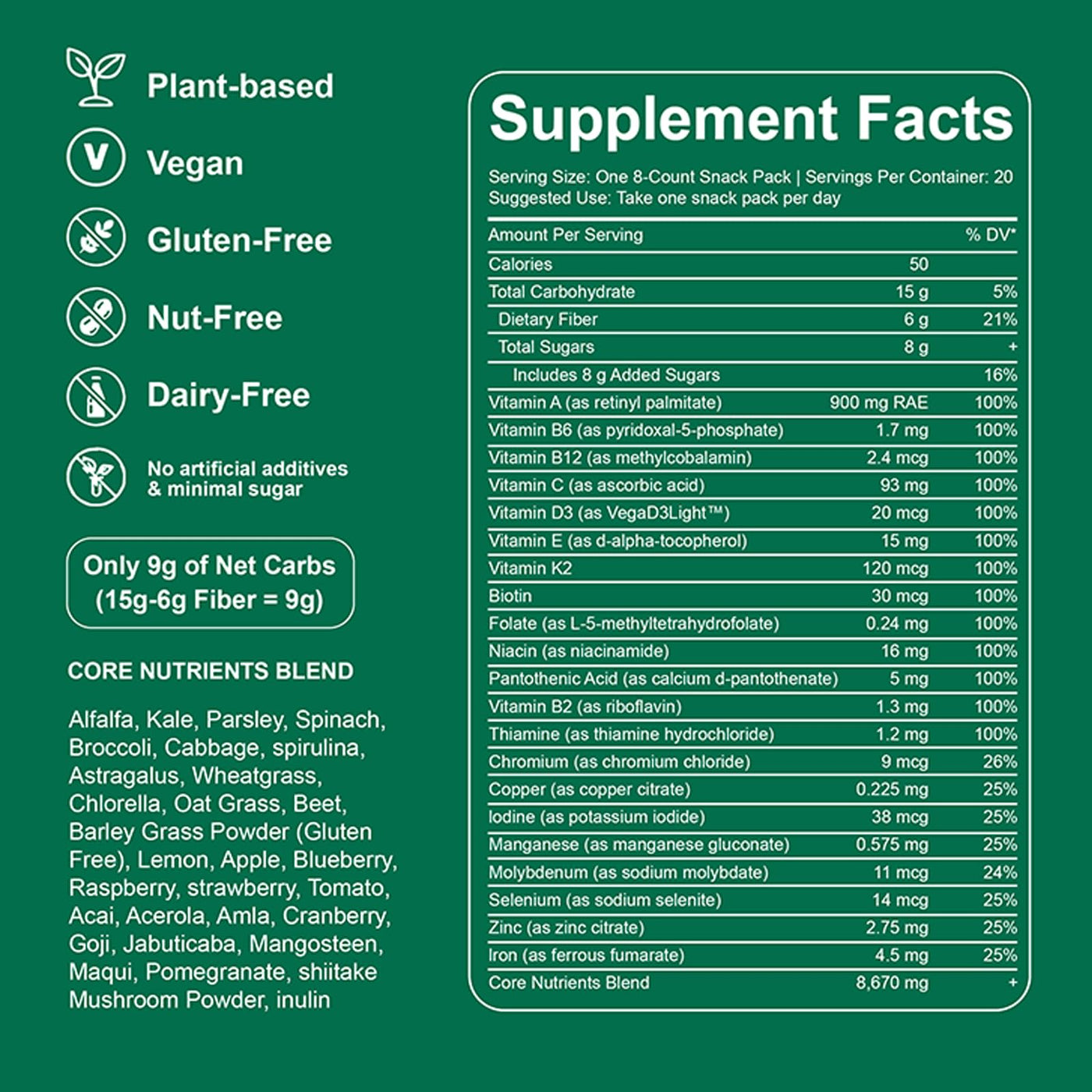 - CAREFULLY FORMULATEDEach packet Greens Gummies is made with the finest variety of leafy greens and vitamins, and is made using the highest quality production processes, keeping you active and focused, and supporting overall health