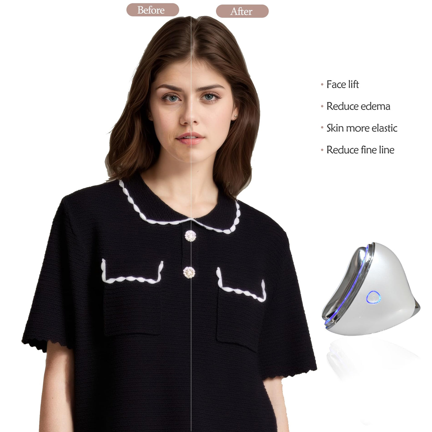 - Lift, Tone and Drain Lymphatic FluidsCombines gentle heat with a vibration function to deliver a spa-like experience at home, draining lymphatic fluids while toning and helping lift. A built-in 630nm far-infrared wave works to rejuvenate your complexion and gives assist in collagen-production, enhancing your skins natural radiance. The light can easily be turned on or off by pressing and holding the "Power" button.
