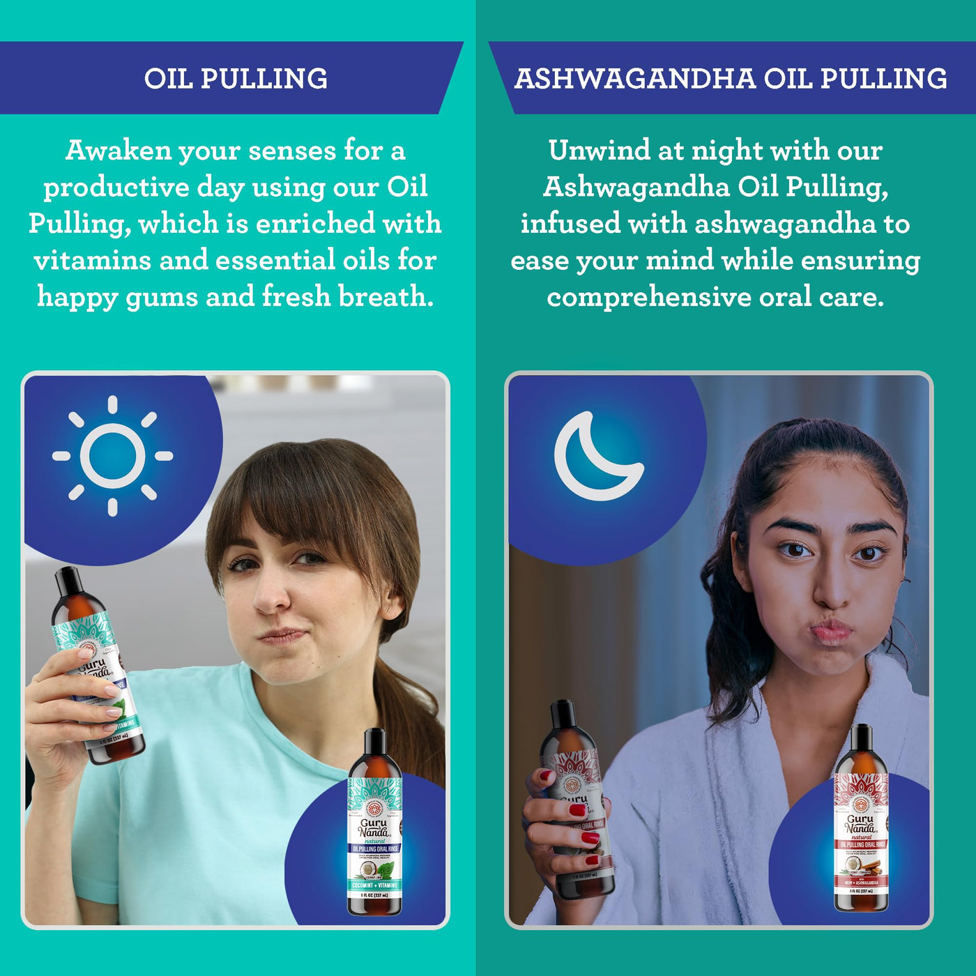 - GuruNanda Whitening Pulling Oil is a natural, pre-brush rinse inspired by Ayurvedic wisdom. It comes as two 8 oz bottles with a stainless steel tongue scraper inside the box. It promotes fresh breath & a clean mouth. This alcohol-free mouth rinse is crafted with 100% pure, natural ingredients like MCT Coconut Oil and Peppermint Essential Oil, reflecting Ayurvedic traditions.
