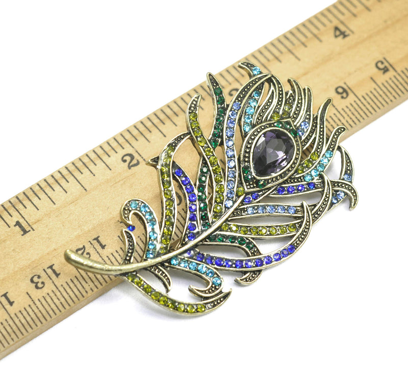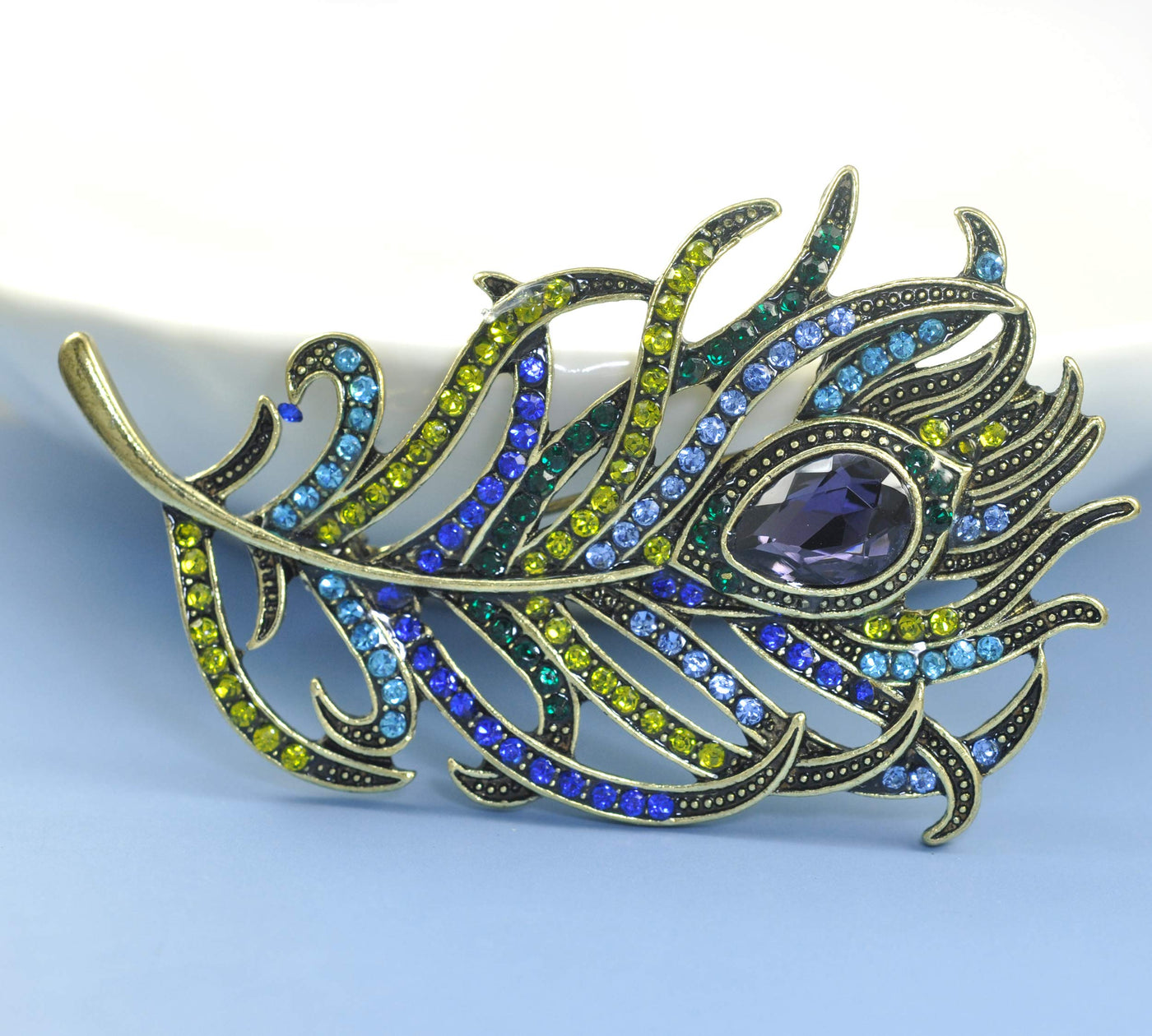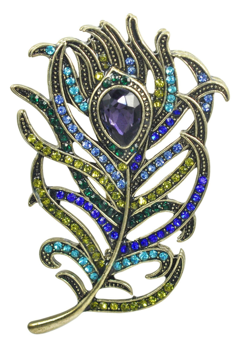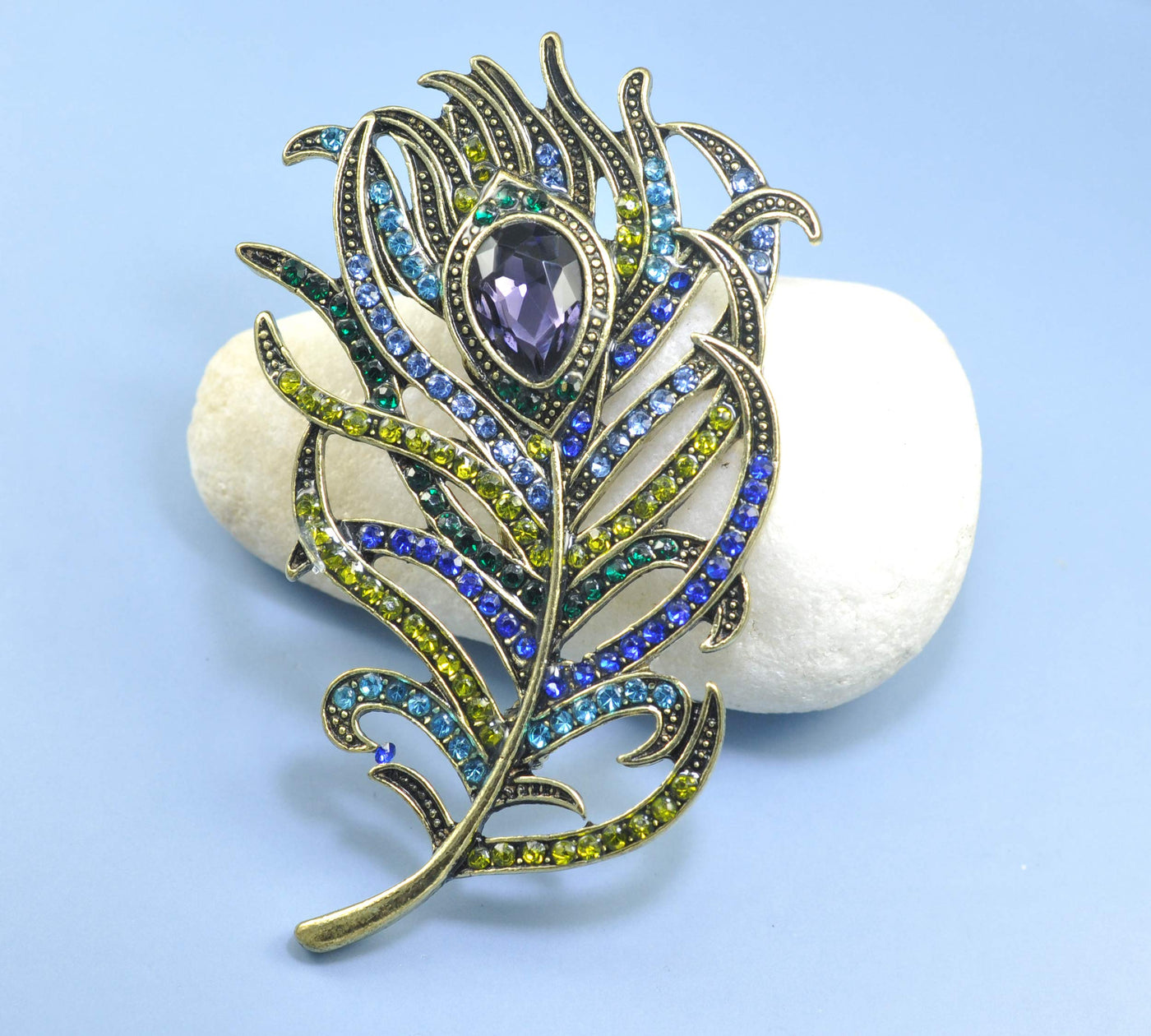 - UNIQUE DESIGN - This is a beautiful retro style peacock feather plume pin brooch with a teardrop cut of purple crystal stone and a various blue and green dazzling rhinestones.