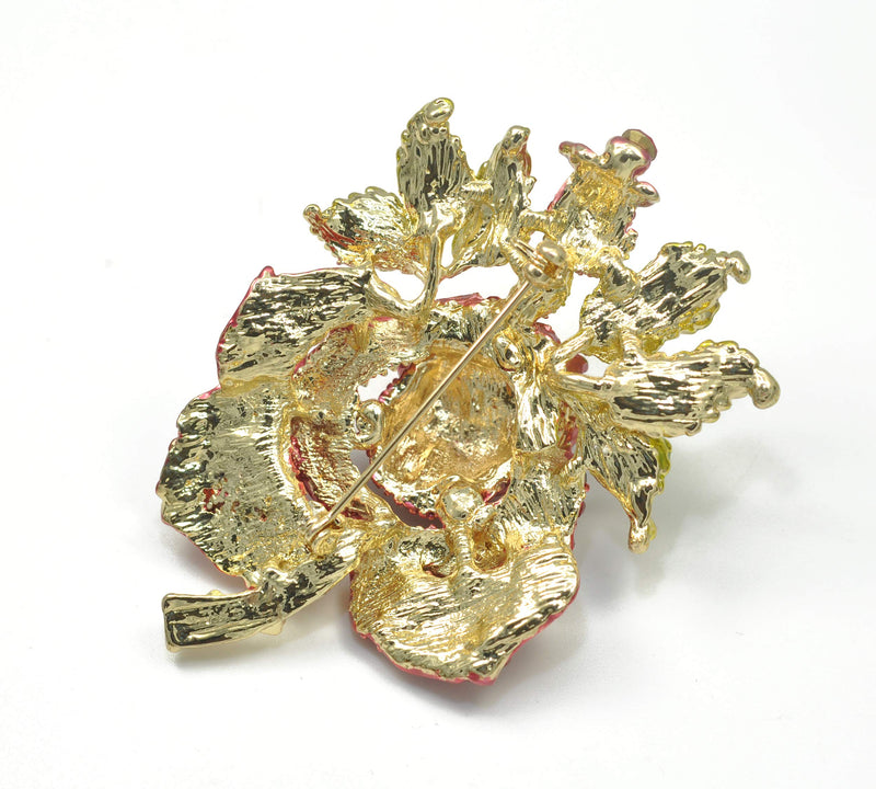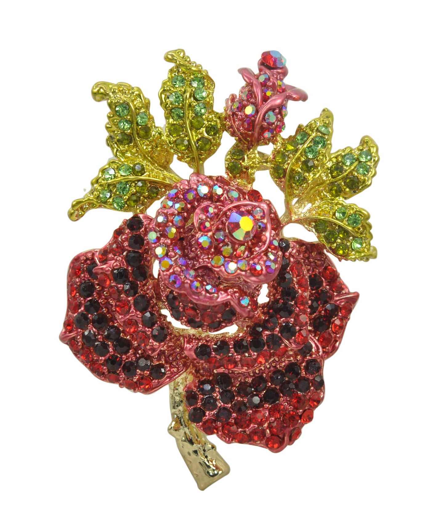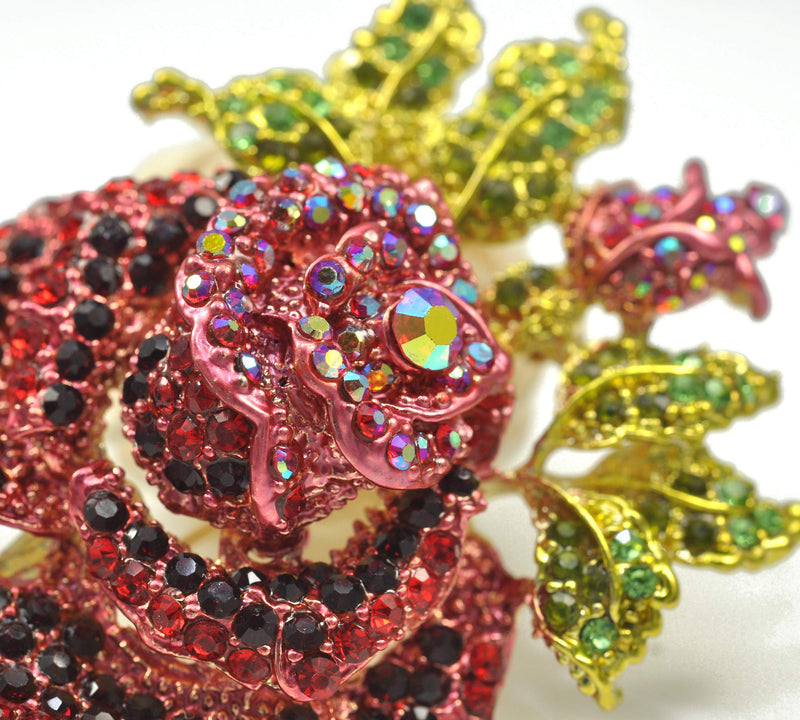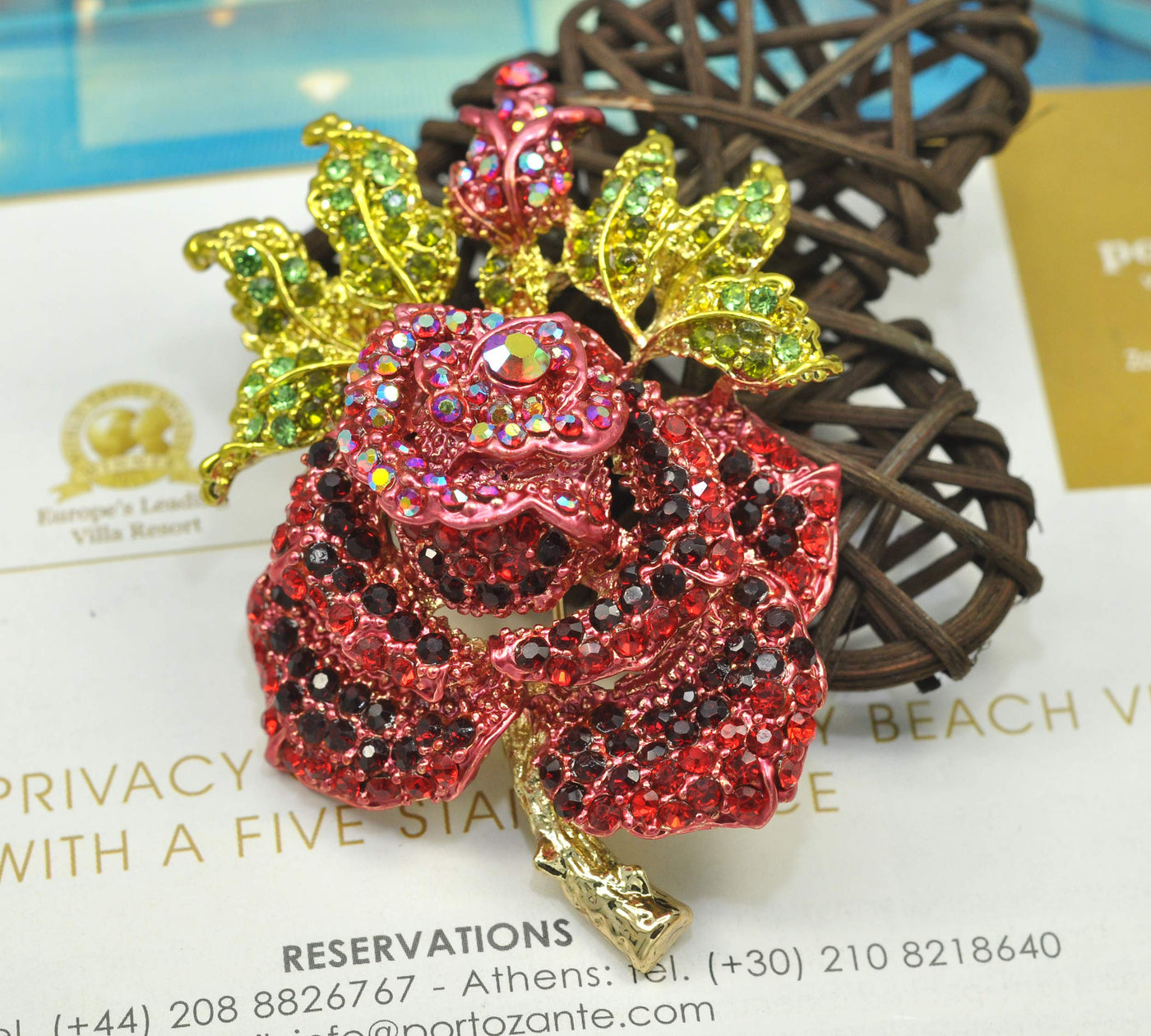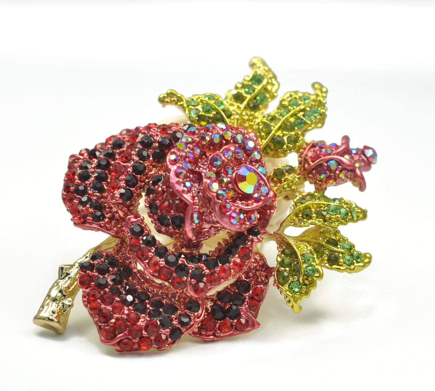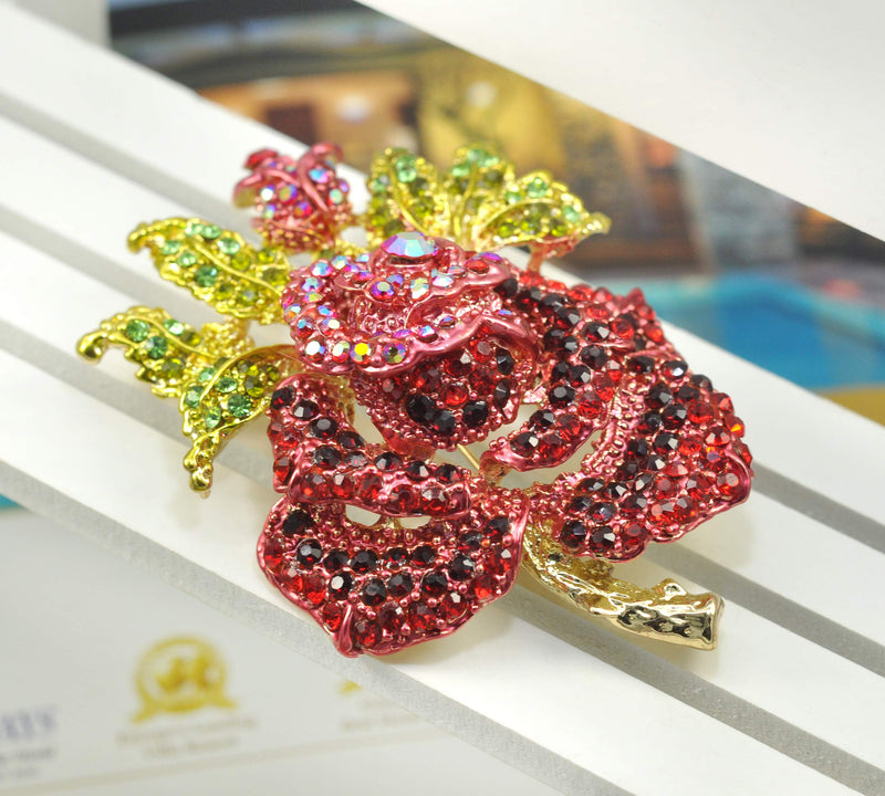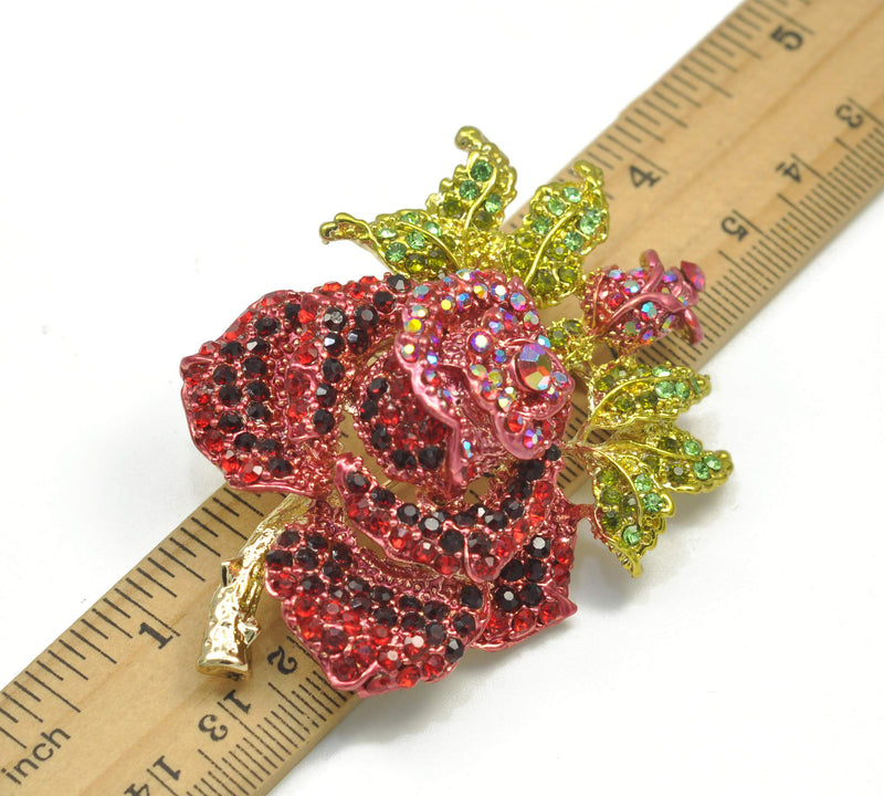 - UNIQUE DESIGN - This large brooch has blooming rose with red,green,AB colored crystal rhinestones
