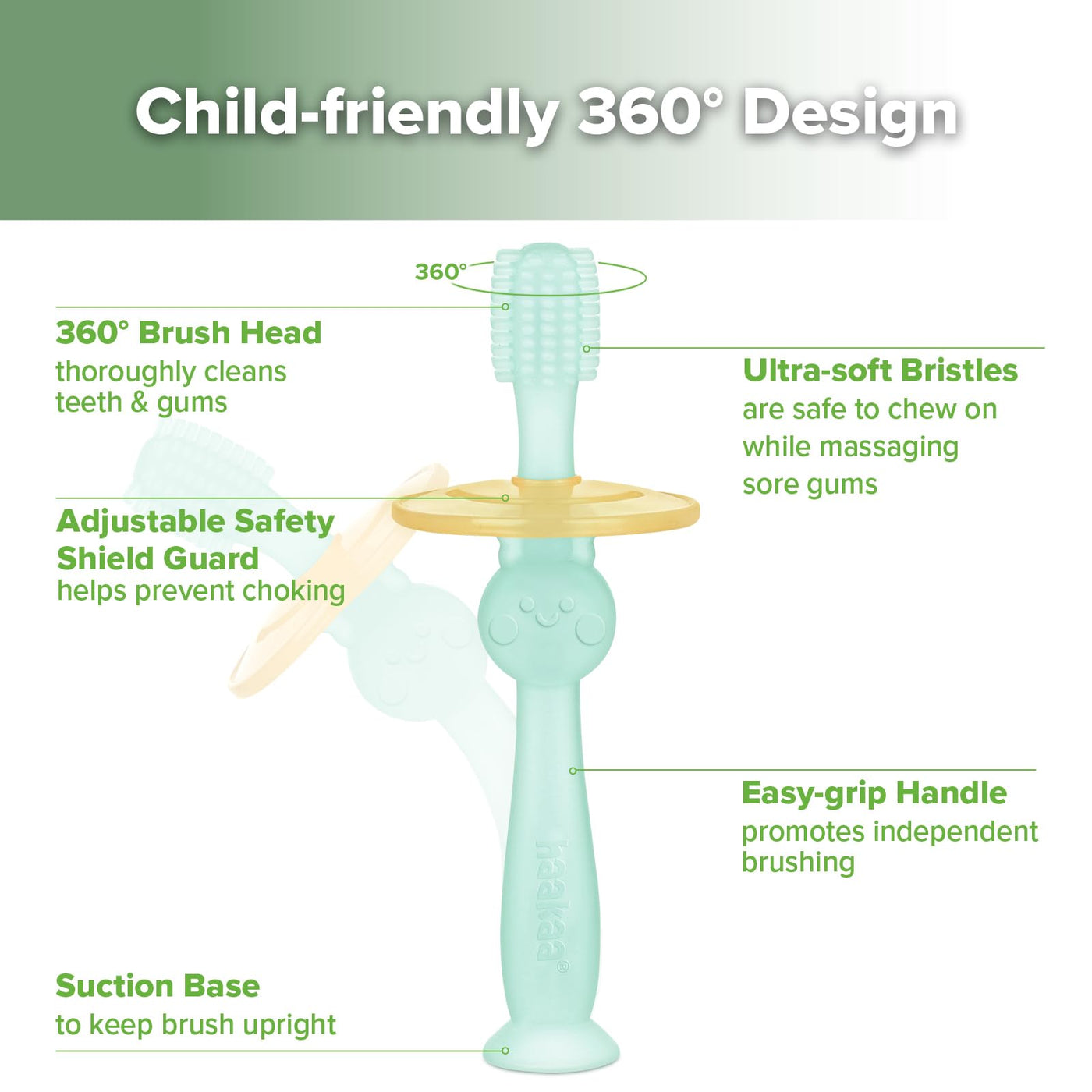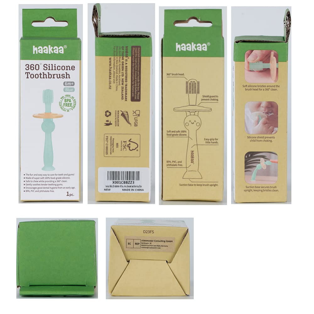 haakaa 360° Baby Toothbrush with Suction Base - Gentle Cleaning for Toddler's Self-Brushing Training, Food-Grade Silicone, Adjustable Safety Shield - Blue (1 Piece)