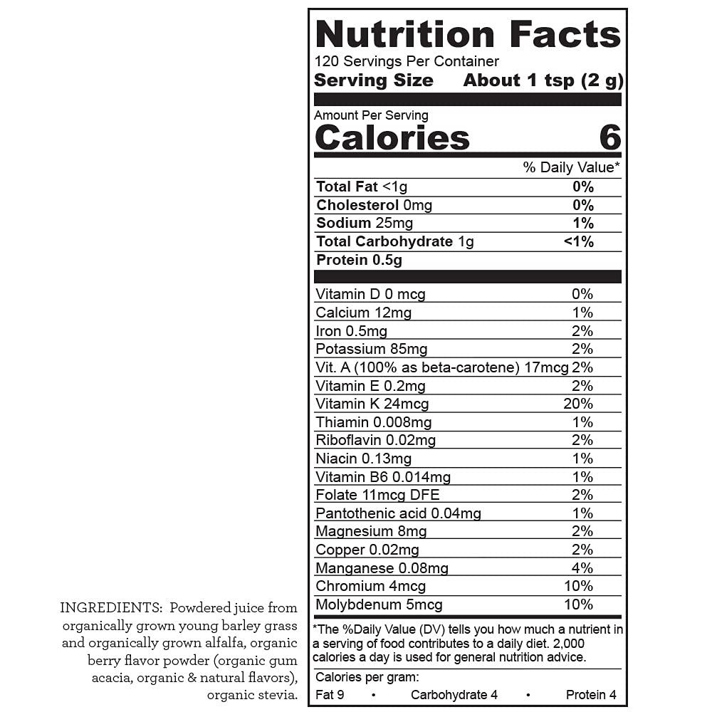 - Blend of raw organic barley and alfalfa; gives you one of the widest spectrums of naturally occurring nutrients in a single source