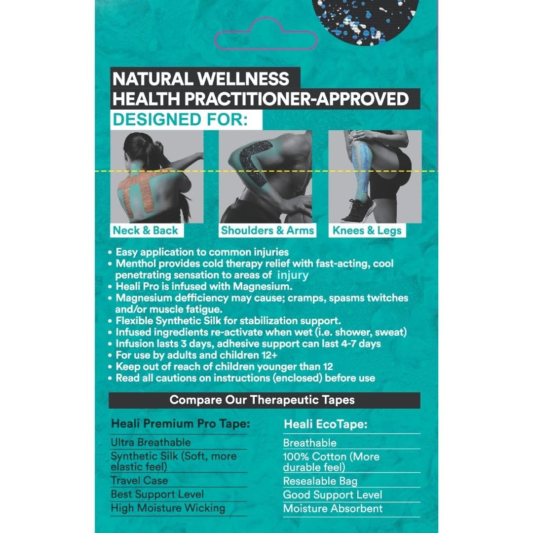 WHAT IS HEALI TAPE: Heali tape PRO is the first tape on the market infused directly with Magnesium and Menthol providing extra benefits to support active lifestyles and more. QUALITY YOU CAN TRUST: Heali PRO is created and trusted by healthcare practitioners. Our K-Tape has a mild, non-offensive scent and is safe for ages 12 and over. Heali PRO Tape is made from soft, breathable synthetic silk with strong (sticky) adhesive that lasts for 4-7 days. TESTING AND CERTIFICATIONS: Heali Tape PRO is latex free, hypoallergenic; 3rd party tested safe. FSA & HSA ELIGIBLE. SCIENCE: Magnesium & Menthol are ancient trusted NATURAL ingredients proven to have many health benefits. Menthol has been commonly used for a long time for temporary soreness ease and provides a cooling sensation. Magnesium is a wonder element that helps with so many enzymatic reactions in our body. Magnesium can also help prevent further injuries as well as accelerate healing. COMMON CONDITIONS: Heali PRO Tape provides stability, supports muscles and joints and ease tissue pressure which can help prevent, stabilize and treat many conditions. It can help with: head tension, neck discomfort, shoulder soreness, tennis elbow, golfer’s elbow, wrist strain, tendon strain, tendon sheath irritation, mid-back tension, lower-back discomfort, ITB tightness, quad soreness, muscle strains (e.g., hamstring), calf tightness, shin discomfort, heel and foot aches, plantar fascia strain, and more.