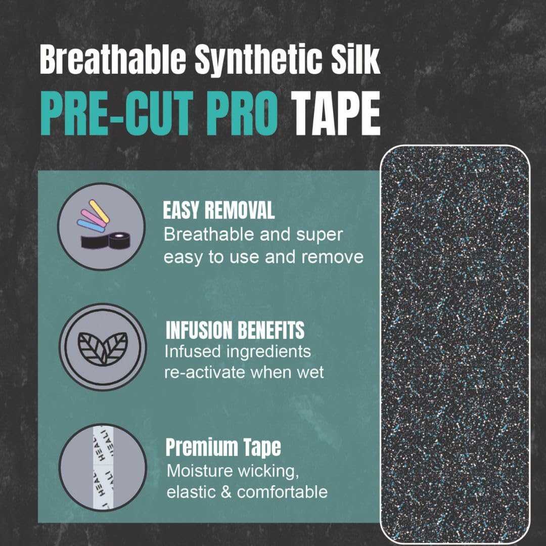 - PRODUCT DETAILS AND PERFORMANCE: 20 precut strips per roll of pro kinesiology tape. Strip Size (Width x Length) - 5cm x 25cm 2" x 10"; Product Type: Precut. Heali PRO Kinesiology Tape is infused with Magnesium and Menthol.