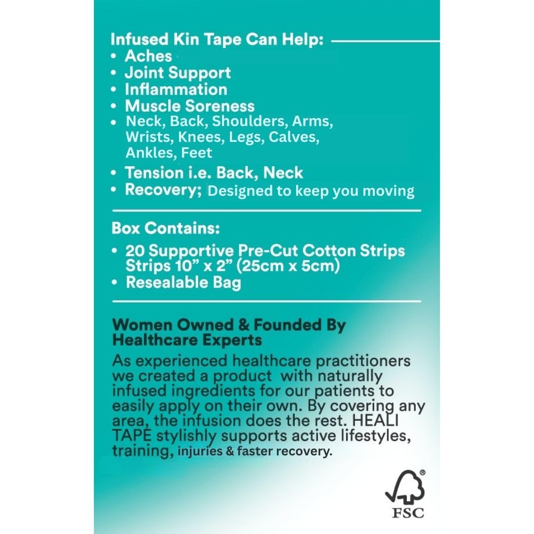 - QUALITY YOU CAN TRUST: Heali K-Tape has a mild, non-offensive scent and is safe for ages 12 and over. Heali ECO Tape is made from soft cotton with strong (sticky) adhesive that lasts for 4-7 days.