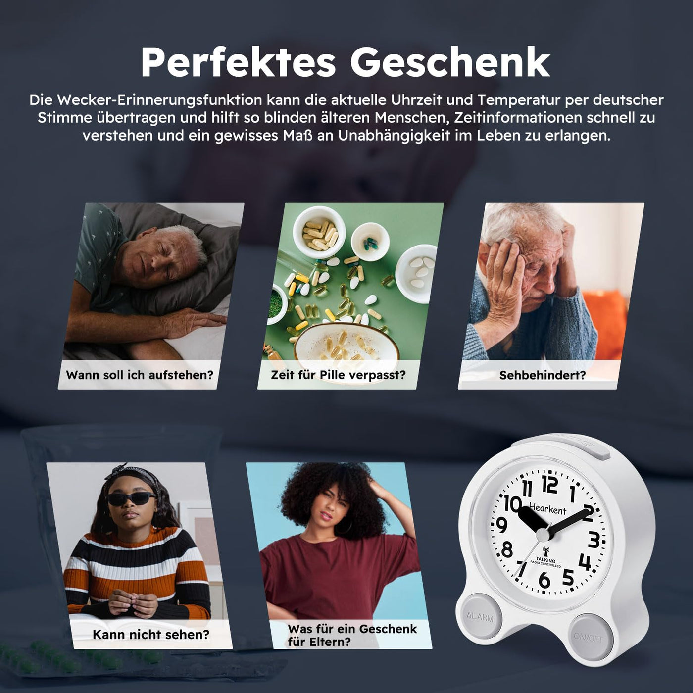 - Talking clock for blind or visually impaired people: This talking alarm clock has a pleasant German voice. It can speak: time, date, week, temperature and reception status. For example: first press: "It's 10:09, the temperature is 23C" -- second press: "Today is Friday October 21st." -- Third push: "Time updated." It is a perfect talking watch for visually impaired, blind and elderly people.