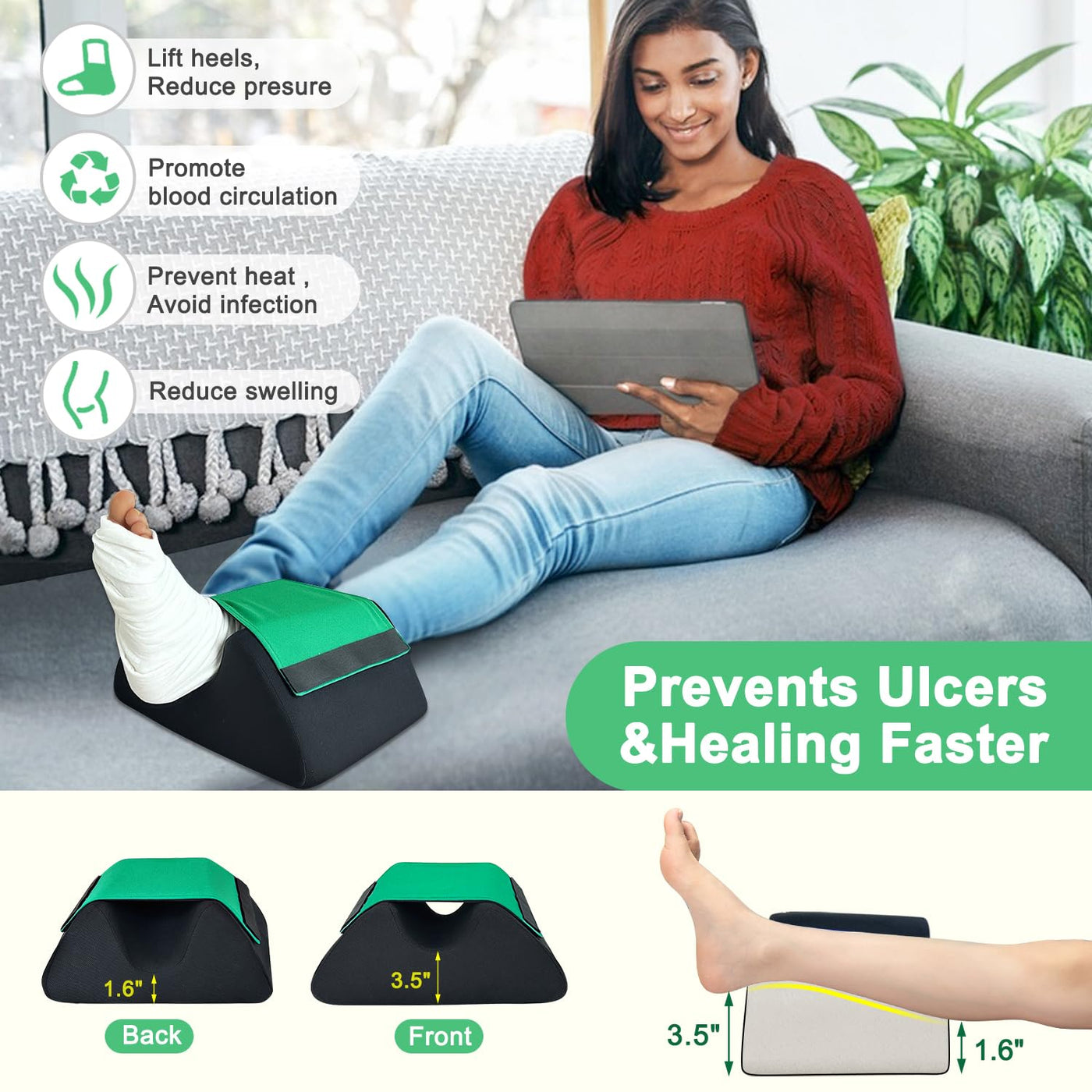 Heel Protectors for Pressure Sores, Foot Elevation Pillow Post Surgery Ulcer Cushion, Foam Bedsore Relief Pillows Feet Leg Support Wedge, Elevate Feet Recovery Supplies Ankle Elevator for Swelling Are you looking for a foot surgery recovery supplies that can effectively prevent pressure sores and provide stable support? NEAUDE Foot Elevation Pillow is exactly what you need. Why Choose NEAUDE? Designed to prevent bedsores, heel protector cushion elevates feet to relieve prolonged pressure. Effectively improve blood circulation, suitable for bedridden patients and the elderly use. Whether in the hospital, at home, heel cushion can provide you with a full range of comfortable care. 【Stable Base】 The wide base of heal protectors provides strong stable support for the foot elevation. Foam heel protectors ensure that foot is fixed in an elevated state, avoiding pressure or discomfort caused by sliding. Heal protectors help maintain ideal posture, relieve leg/foot pressure, bring better quality of rest. 【Not Easy to Deform】 With medical grade high density foam inner, pressure ulcer cushion provides excellent support and durability. Leg elevator pillow will not deform even after prolonged use, keep continuous comfort experience . Made of soft and breathable polyester material, leg elevator pillow allowing you enjoy more skin-friendly care experience. Heel pillow's matching design of green and black alleviates the user's visual fatigue. 【Ergonomic Design】 Heel protector cushion has loop fasteners adjustable design. You can freely adjust it according to your personal needs and foot circumference. U-shaped groove design can better fit the foot, keeping the foot stable and avoid sliding. Whether you care for yourself, family, the bed sore pillow relieves foot discomfort. . Note: Vacuum packaging, please wait 48 hours to fully restore its shape.