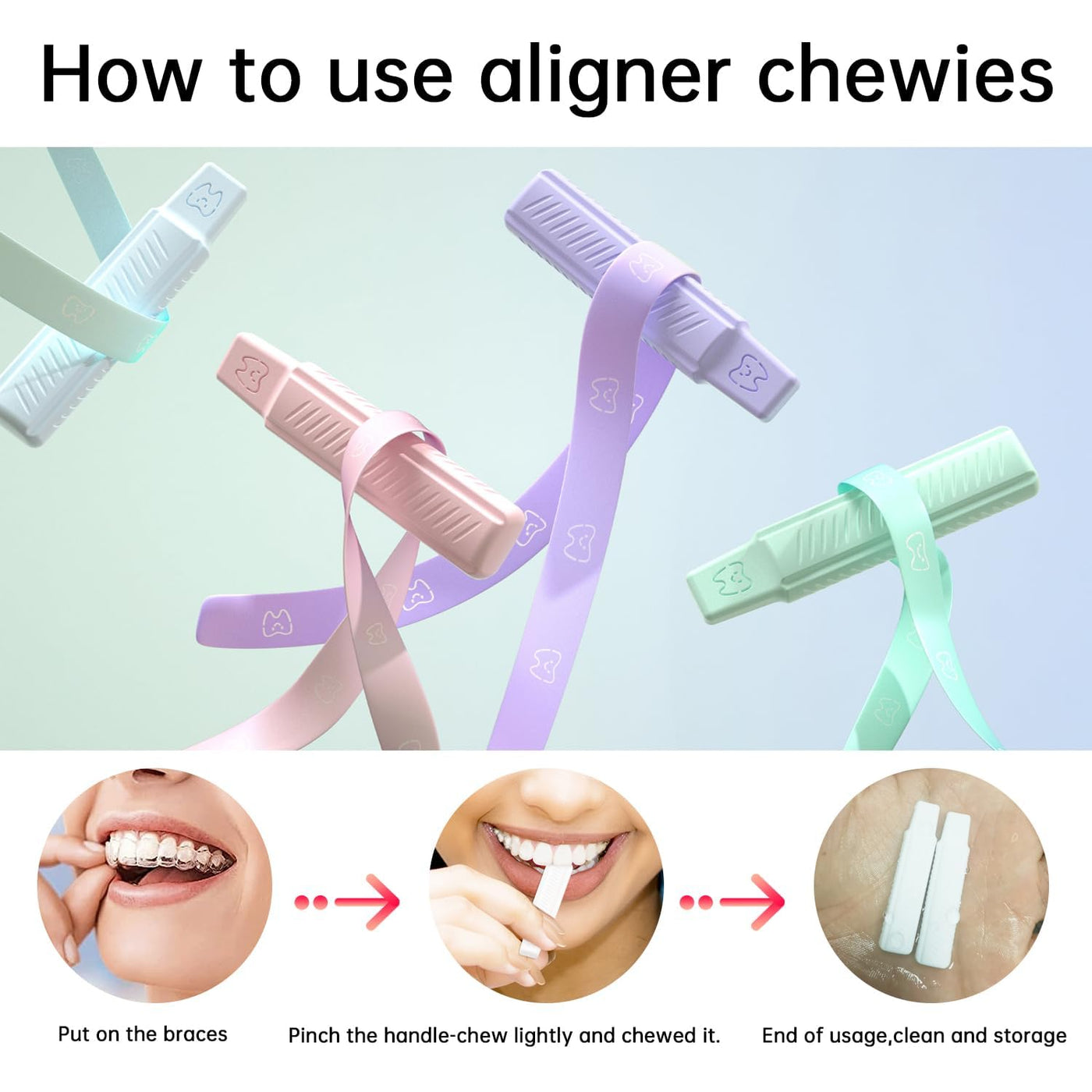 - Cute Handheld Aligner Chewies: It can soothe and relieve the swollen and painful gums caused by the new aligner, and the chewing gel can make the retainer fit your teeth, thus ensuring better orthodontic results.