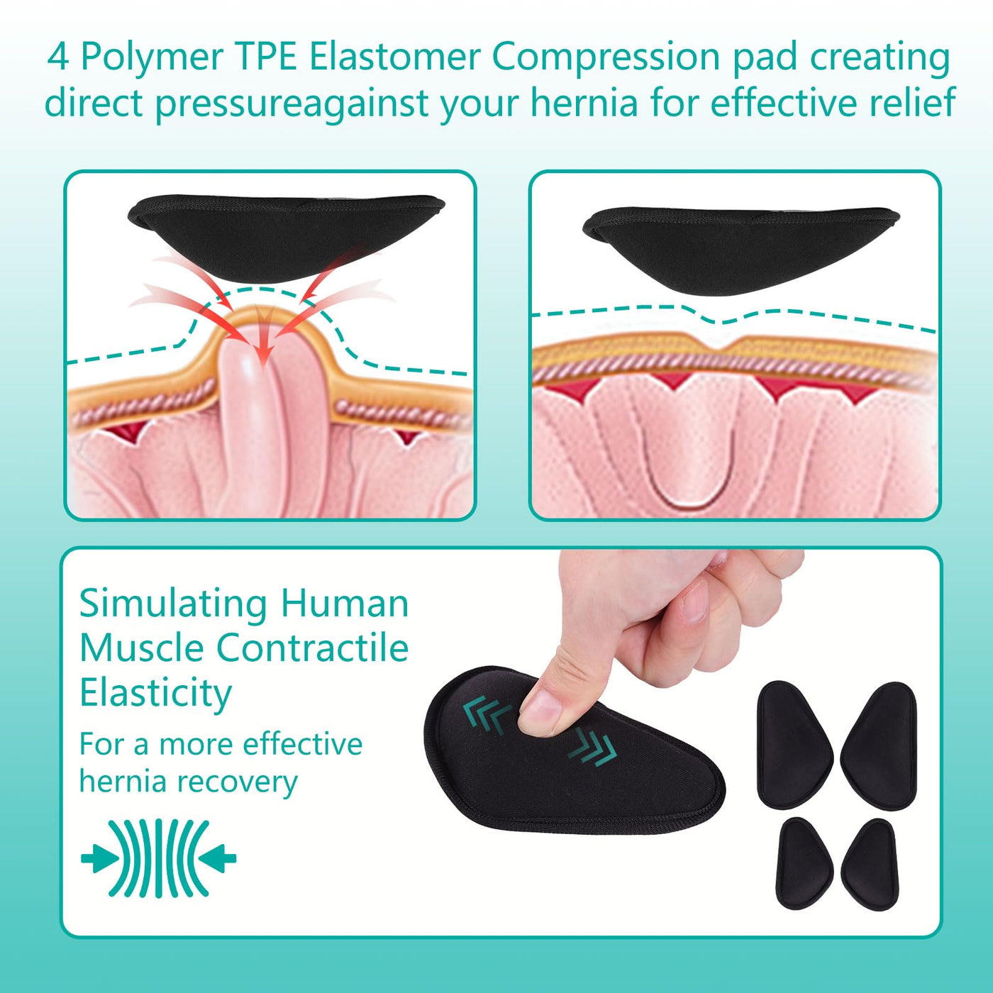 - THOUGHTFUL DESIGN: 4 removable hernia packs provide long-lasting gentle compression for single or double hernias, and the use of convex silicone rubber mimics the texture of human muscles to support weakened inguinal muscles, promote healing and prevent recurrence.