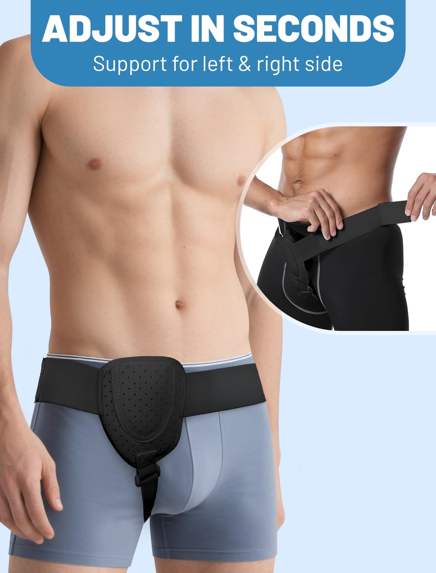 Hernia Belts for Men Inguinal, Hernia Belt for Women, Inguinal Hernia Support for Left or Right Side, Comfortable Adjustable Waist Strap with Removable Compression Pads, Black