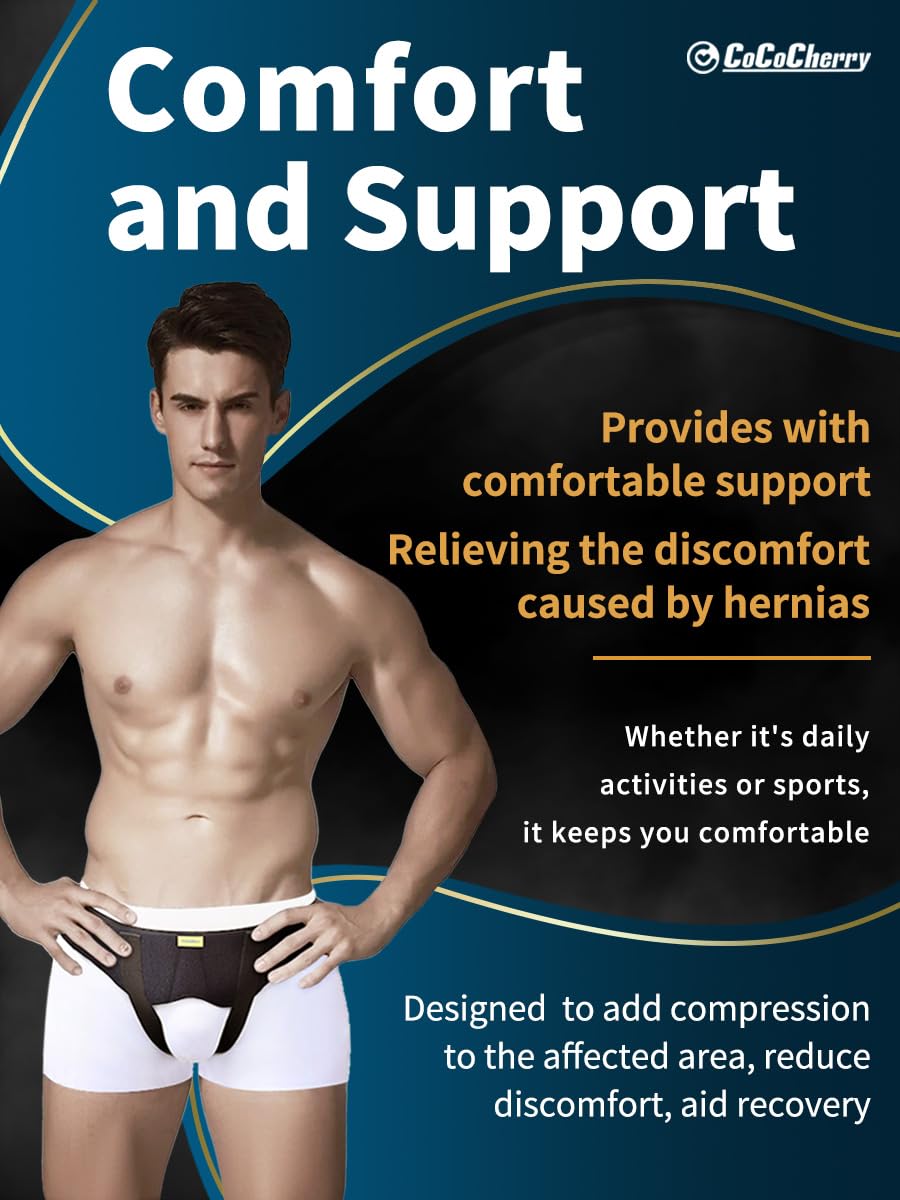 CoCoCherry Hernia Belts for Men - Your Reliable Partner for Hernia Support and Relief!Living with hernias, be it inguinal, sports-related, femoral, or umbilical, can be uncomfortable and challenging. That's where our CoCoCherry Hernia Belts step in to provide you with the customized support and comfort you need.Customizable Hernia Support: Designed to cater to single or double hernias, our belts are engineered to alleviate the pain and discomfort associated with hernias. Whether you're dealing with inguinal or sports hernias, our solution offers personalized relief.Enhanced Compression with Removable Pads: Our hernia belts come equipped with two removable compression pads, ensuring optimal support for weakened muscles. These pads gently apply gradual pressure to the affected area, delivering effective hernia support on both sides.Comfortable and Breathable: Crafted from skin-friendly, durable materials, our belts are perfect for extended wear beneath your clothing. Experience comfort and breathability, allowing you to go about your daily activities with ease.360° Adjustable with Velcro: Tailored to your needs, our adjustable straps provide stability and relief to the herniated area. Whether you're preparing for hernia surgery or in post-surgery recovery, our belt can be effortlessly customized to ensure your comfort.Easy Application and Removal: Our high-quality hernia truss is designed for convenience. Easily put it on and take it off as needed, without any hassle. The medical-grade closure mechanism guarantees a secure fit during use.Experience the freedom to move and the relief you deserve with CoCoCherry Hernia Belts for Men. Take the first step towards a more comfortable, active life. Get yours today and embrace hernia support that fits you perfectly!