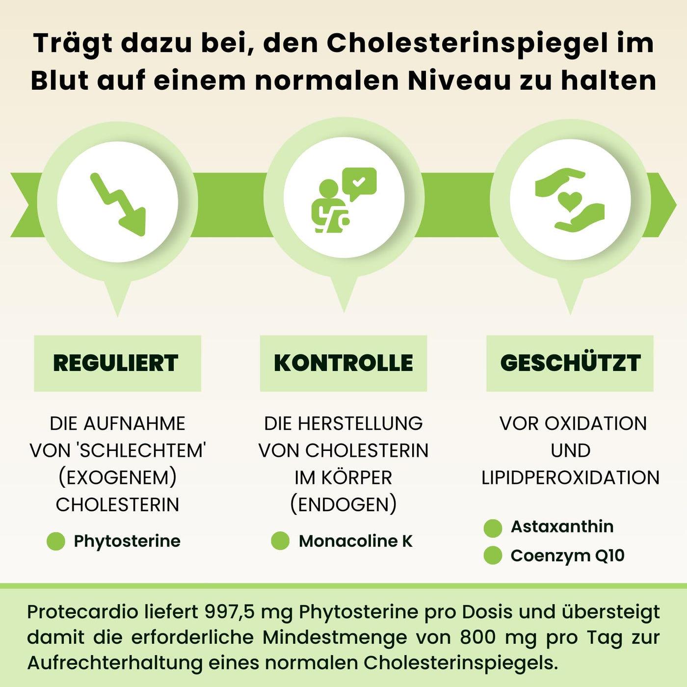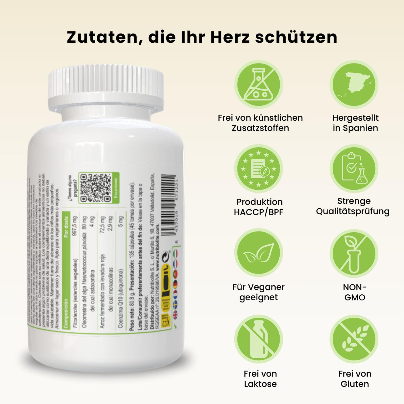 Cholesterol lowering capsules in high doses with plant sterols 998 mg, red rice yeast 2.9 mg monacolin K, Co-Q10 + astaxanthin. 135 vegan capsules without additives – Protecardio