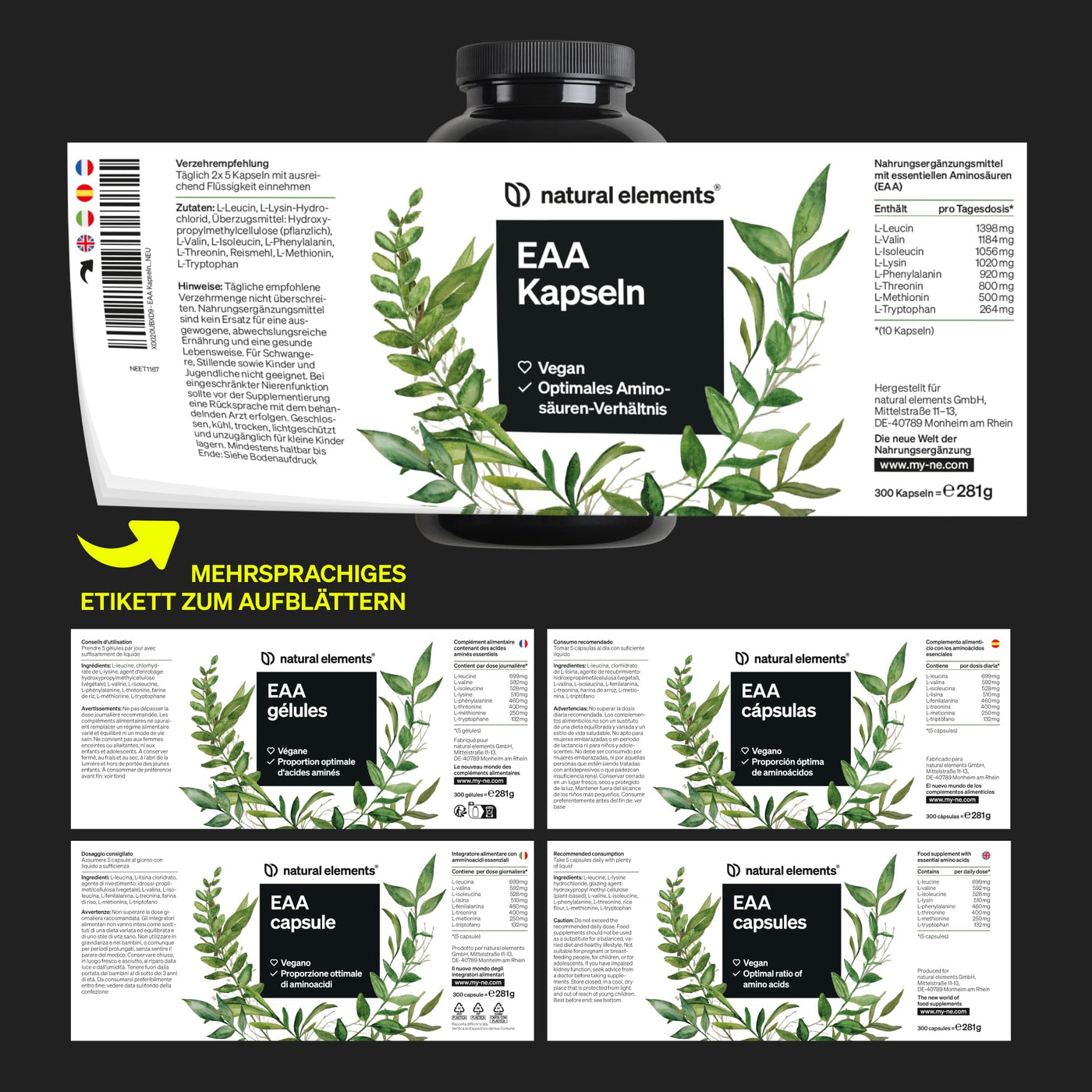EAA capsules high dosage - 300 capsules - 8 essential amino acids - vegan, without unnecessary additives - produced in Germany & laboratory tested