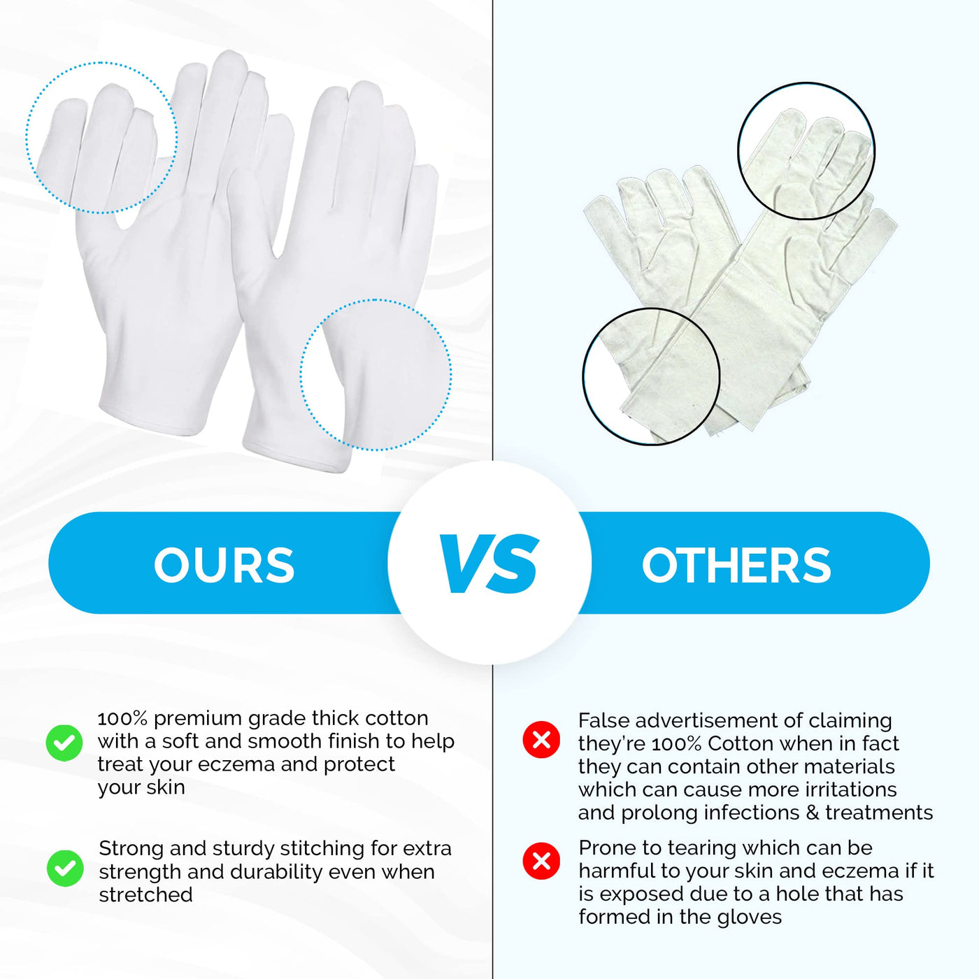 - WHITE COTTON GLOVES FOR ECZEMA - Our Moisturising Gloves are made from soft & smooth cotton which enables efficient absorption of creams & ointments. Our white cotton gloves for dry hands are the perfect solution for treatment of eczema, concealed skin disorders and other skin related issues.
