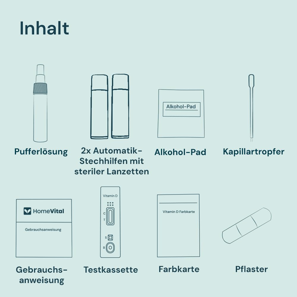 - SCOPE OF DELIVERY: 1 x Vitamin D-Check self-test including 1x test cassette in a foil bag, 1x capillary dropper, 1x alcohol swab, 1x sample dilution buffer solution, 2x automatic lancing devices with sterile lancet, 1x color card, 1x plaster and 1x instructions for use.
