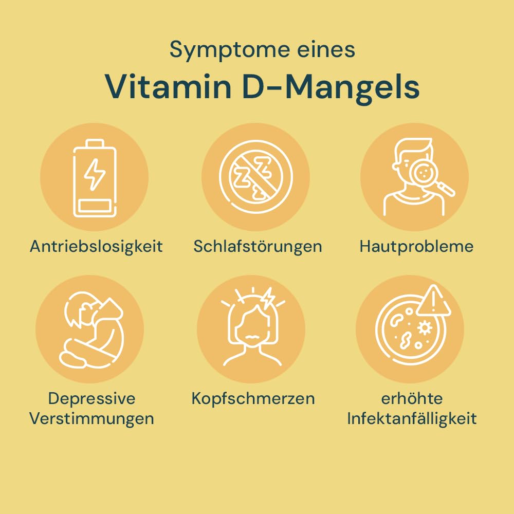 - YOU HAVE THE FOLLOWING SYMPTOMS? Hair loss, skin problems, tiredness, exhaustion, listlessness, depressed mood, sleep disorders or headaches. Any of these symptoms can be an indication of a vitamin D deficiency.