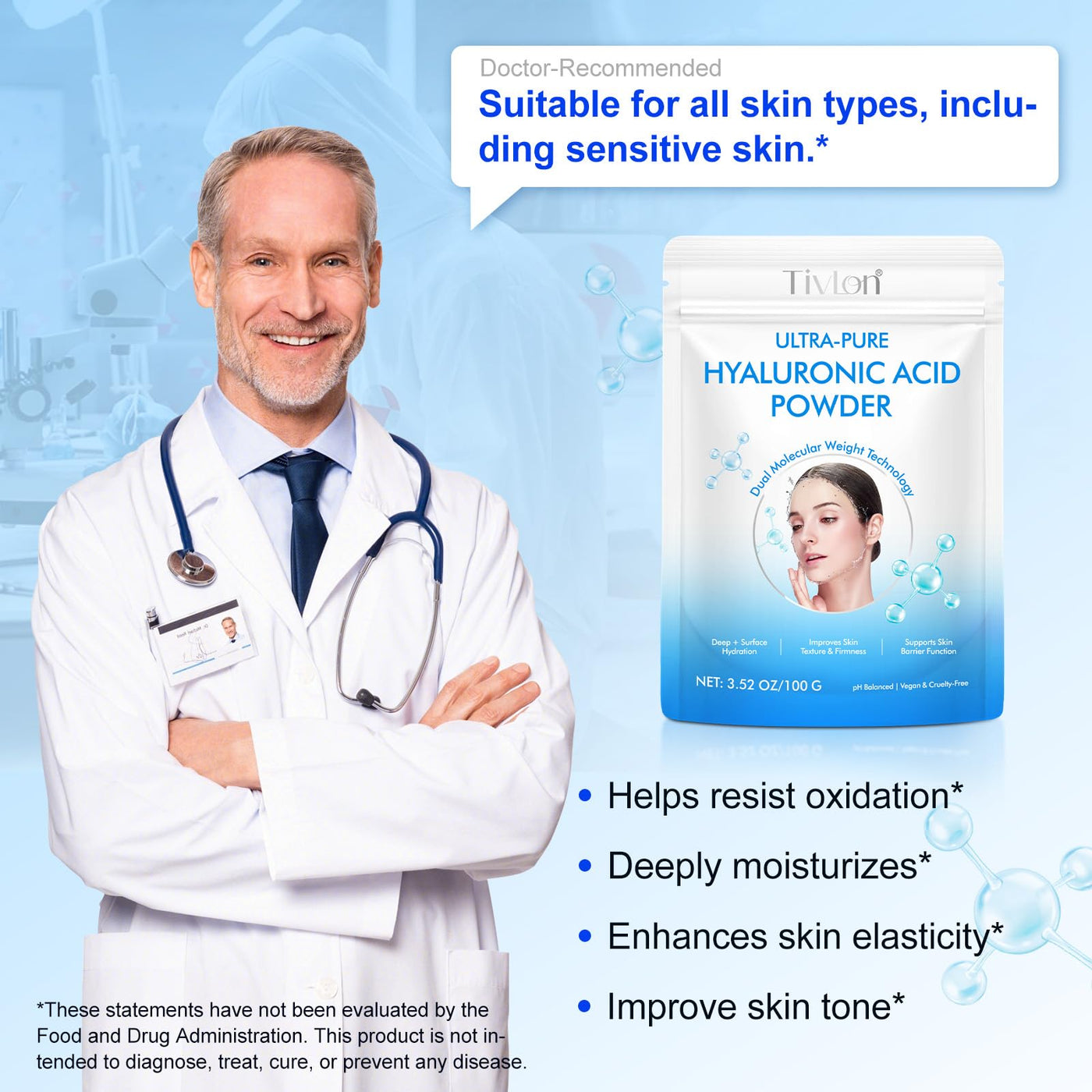 - Premium Quality You Can Trust: Lab-tested for purity, vegan-friendly, and non-GMO. Our hyaluronic acid powder for skin is crafted in GMP-certified facilities to deliver effective hydration without unnecessary fillers.
