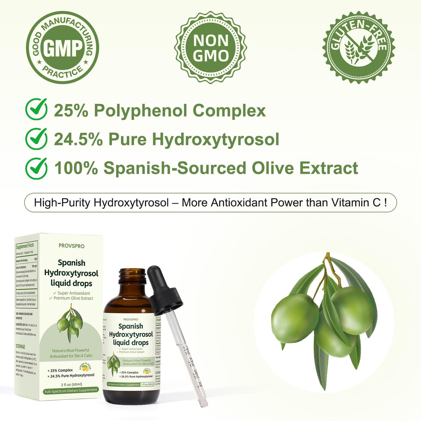- Spanish Olive Extract: This hydroxytyrosol liquid supplement is made from real Mediterranean olive fruit(Olea Europaea) from Spain. Each 100 mg of raw material is standardized to contain 24.5% pure hydroxytyrosol & 25% hydroxytyrosol complex. It is rich in a variety of active polyphenols naturally present in extra virgin olive oil, such as tyrosol and olive glycosides, which have shown good antioxidant activity in in vitro studies and are widely used to support cell health and skin conditioning.