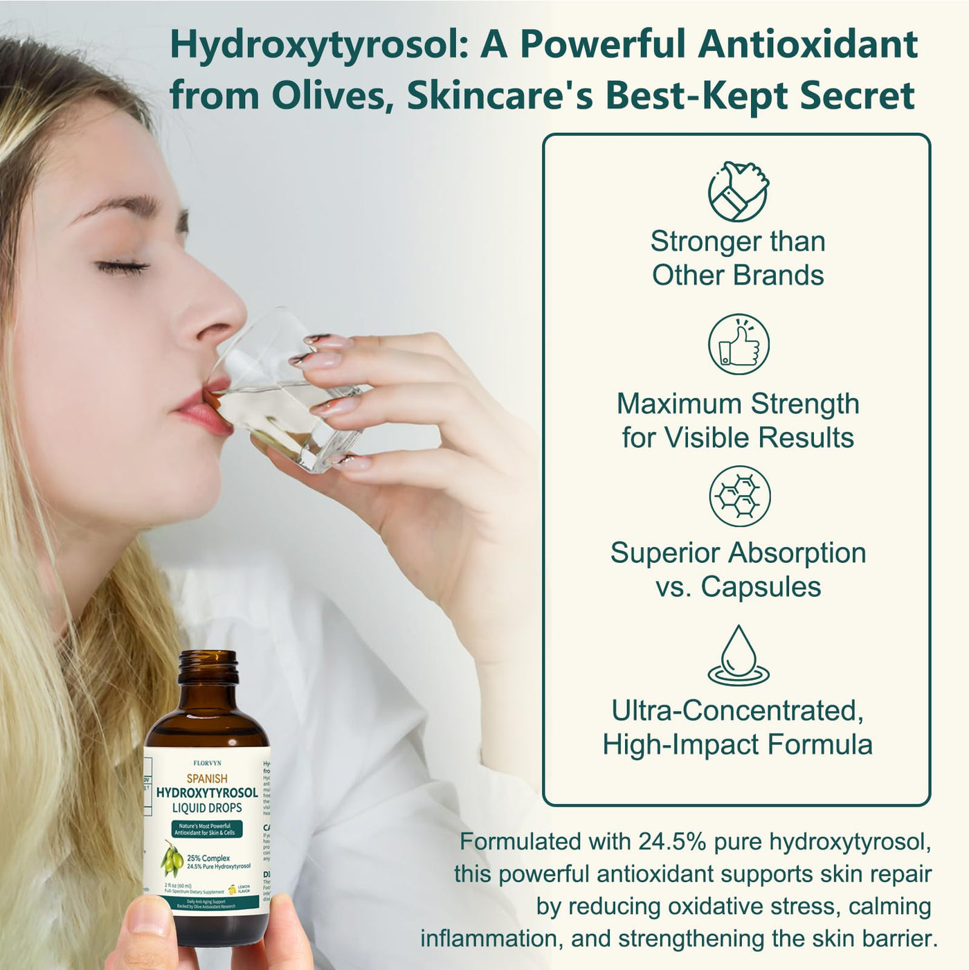 - Clinically Backed Multi-Action Skincare: Pure hydroxytyrosol is a clinically proven, highly effective antioxidant ingredient that can deeply neutralize free radicals and protect against skin damage caused by oxidation. It also has a anti-inflammatory effect, helps regulate the bodys inflammatory response. Finally, the hydroxytyrosol supplement can inhibit collagen degradation, promote cell renewal, delay skin aging from the source, and achieve anti-aging repair from the inside out.