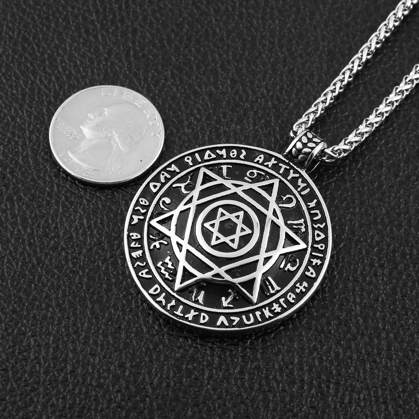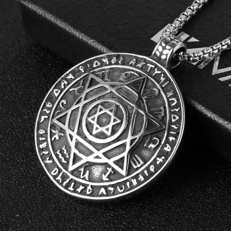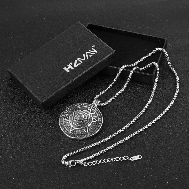 Seal Solomon Six-Pointed Star 12 Constellation Pendant The "Talisman for Good Health", combined with the "Seal of Great Prosperity", corresponds to matters relating to vitiality, the healing arts and the life force. Product parameters: Chain: 22" + 2 inches chain extender. 3.0 mm Wide Link chain. Read more Material Type: DURABLE & LONG LASTING; 316 stainless steel. Suitable for daily wear, outdoor, shower, gym and sports. Easy functioning clasp. Robust and strong links. Smooth shining finish.LOW MAINTENANCE; Resistant to discolouration, sweat, heat, tarnish, water, smudge. UNLIKE sterling silver, gold, brass, fashion plated jewellery. Can be stored away without tarnishing.HYPOALLERGENIC FINISH; Suitable for sensitive skin and allergy prone skin. Will not irritate skin or cling to clothing. Please do not use if allergic to stainless steel. Read more Package Included: 1 x Pendant Necklace1 x Chain: 22" + 2 inches chain extender. 3.0 mm Wide Link Chain1 x Including a beautiful gift box printed with Brand Name "HZMAN" logo Read more Color Type: blackgoldensilver Read more Perfect Jewelry Gift to Adults: Teens, Old People and Kids and is the Gift for Festivals or Parties, Such As Halloween, Thanksgiving, Christmas, Boxing Day, New Year, Birthday, Anniversary, Graduation, Valentine's Day, Fathers Day Read more