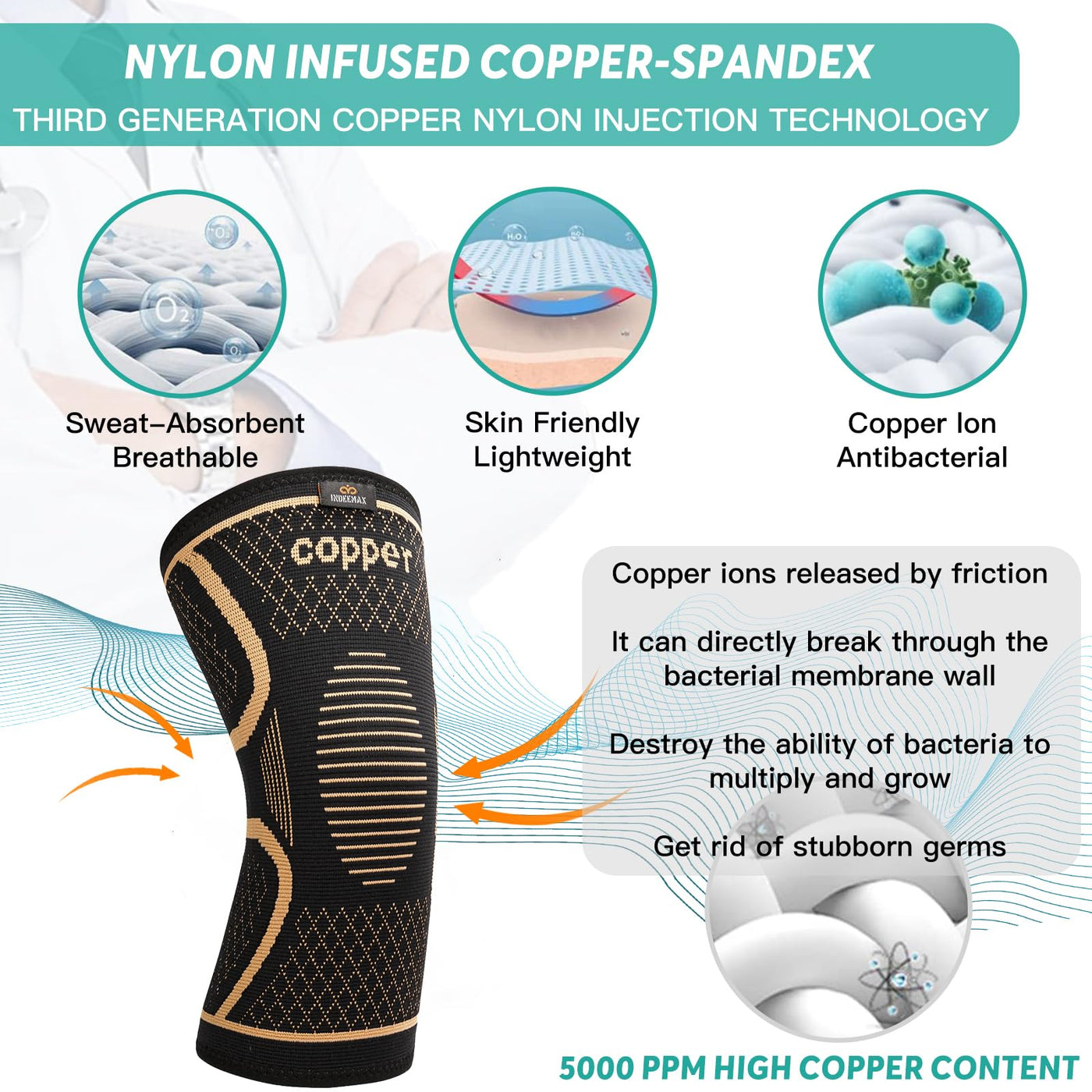 - Copper nylon: 60% copper ion fiber + 21% nylon + 16% polyester. copper ion helps to promote blood circulation and relieve pain and swelling, INDEEMAX uses the latest weaving technology to weave copper ion fiber into knee compression sleeves to help relieve knee pain and also more breathable and sweat absorbent.
