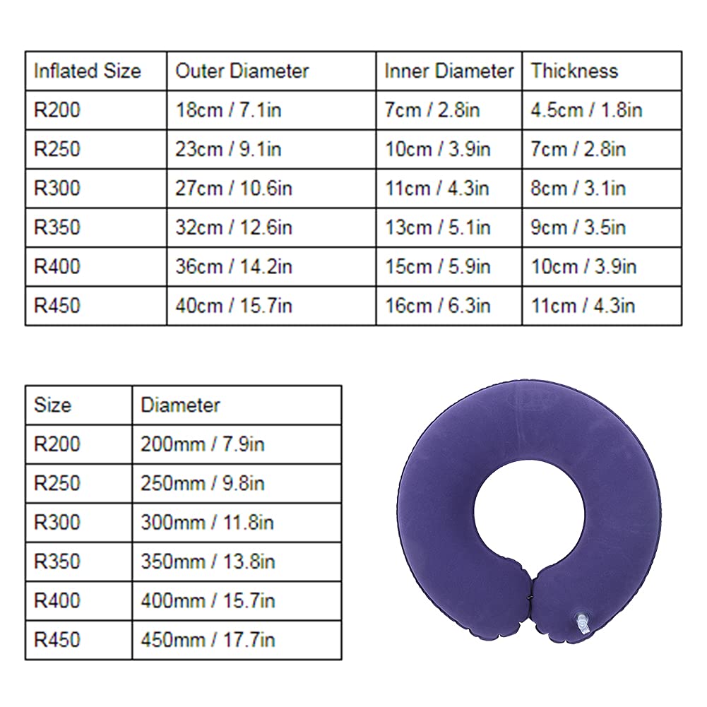 Inflated size: R200 outer diameter: Approx. 18 cm / 7.1 inches, inner diameter: Approx. 7 cm / 2.8 inches, thickness: Approx. 4.5 cm / 1.8 inches R250 outer diameter: Approx. 23 cm / 9.1 inches , Inner Diameter: Approx. 10cm / 3.9in, Thickness: Approx.7cm / 2.8inR300 Outside Diameter: Approx. 27cm / 10.6in, Inside Diameter: Approx. 11cm / 4.3in, Thickness: Approx. 8cm / 3.1inR350 outside diameter: Approx. 32cm / 12.6 inches, Inside diameter: Approx. 13cm / 5.1 inches, Thickness: Approx. 9cm / 3.5 inches R400 outside diameter: Approx. 36cm / 14.2 Inches, Inner Diameter: Approx. 15 cm / 5.9 inches, Thickness: Approx. 10 cm / 3.9 inches R450 Outside Diameter: Approx. 40 cm / 15.7 inches, Inside Diameter: Approx. 16 cm / 6.3 inches, Thickness: Approx. 11 cm / 4.3 inches Inflated size outer diameter Inside diameter thickness R200 18 cm / 7.1 in 7 cm / 2.8 in 4.5 cm / 1.8 in R250 23 cm / 9.1 in 10 cm / 3.9 in 7 cm / 2.8 in R300 27 cm / 10.6 in 11 cm / 4.3 in 8 cm / 3.1 in R350 32 cm / 12.6 in 13 cm / 5.1 in 9 cm / 3.5 in R400 36 cm / 14.2 in 15 cm / 5.9 in 10 cm / 3.9 in R450 40 cm / 15.7 in 16 cm / 6.3 in 11 cm R200 Diameter: Approx. 200mm / 7.9 inches auricle, wrist, heel, ankle, etc. R250 Diameter: Approx. 250mm / 9.8 '' shoulders, arms, legs, etc. R300 Diameter: Approx. 300mm / 11.8 inches face, arm, leg, helper bones, etc. R350 Diameter: Approx. 350mm / 13.8 inches face, legs, elbows, etc. R400 Diameter: Approximately 400mm / 15.7 inches (for thin people) back, hips, , etc. R450 Diameter: Approx. 450mm / 17.7 inches (heavier people) back, hips, hipbones, etc Package list: 1 x inflatable pillow 1 x inflator (random color)