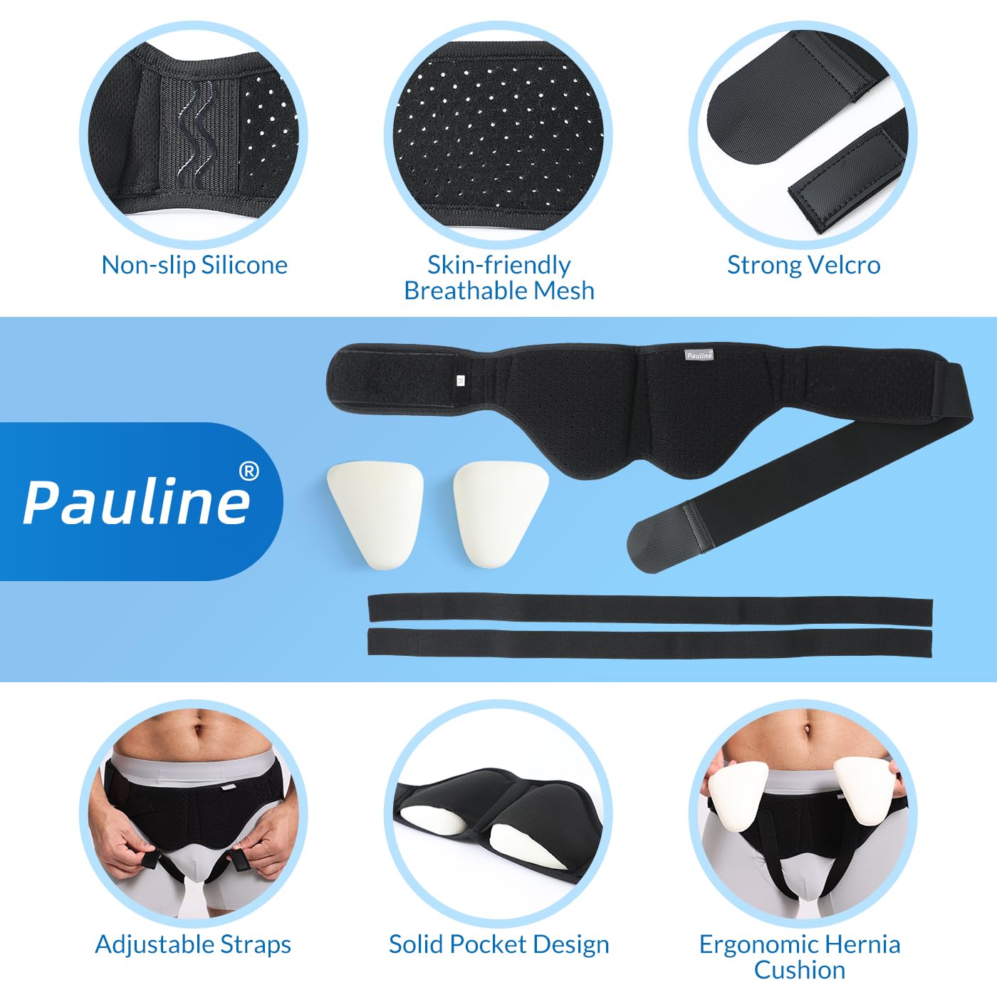 - SECURE ALL-DAY SUPPORT - Pauline inguinal hernia support belt features adjustable groin straps and strong Velcro for a secure fit that stays in place. Non-slip silicone strips on the belt help prevent shifting, ensuring you remain secure and supported throughout the day, no matter your activity level.