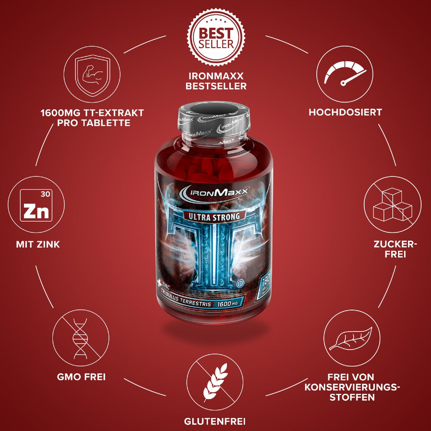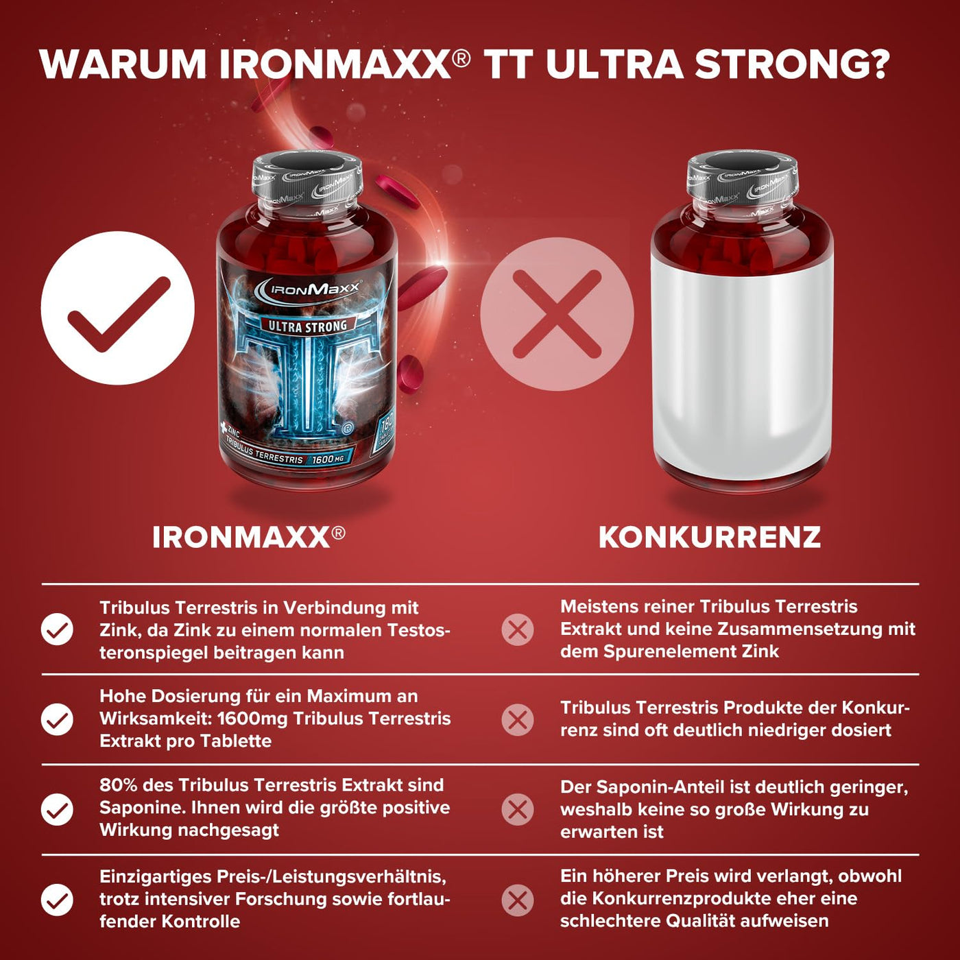 - SCOPE OF DELIVERY: The TT Ultra Strong tablets from IronMaxx are available in a 343.8g packaging. One can contains 180 tablets with high-dose Tribulus Terrestris extract