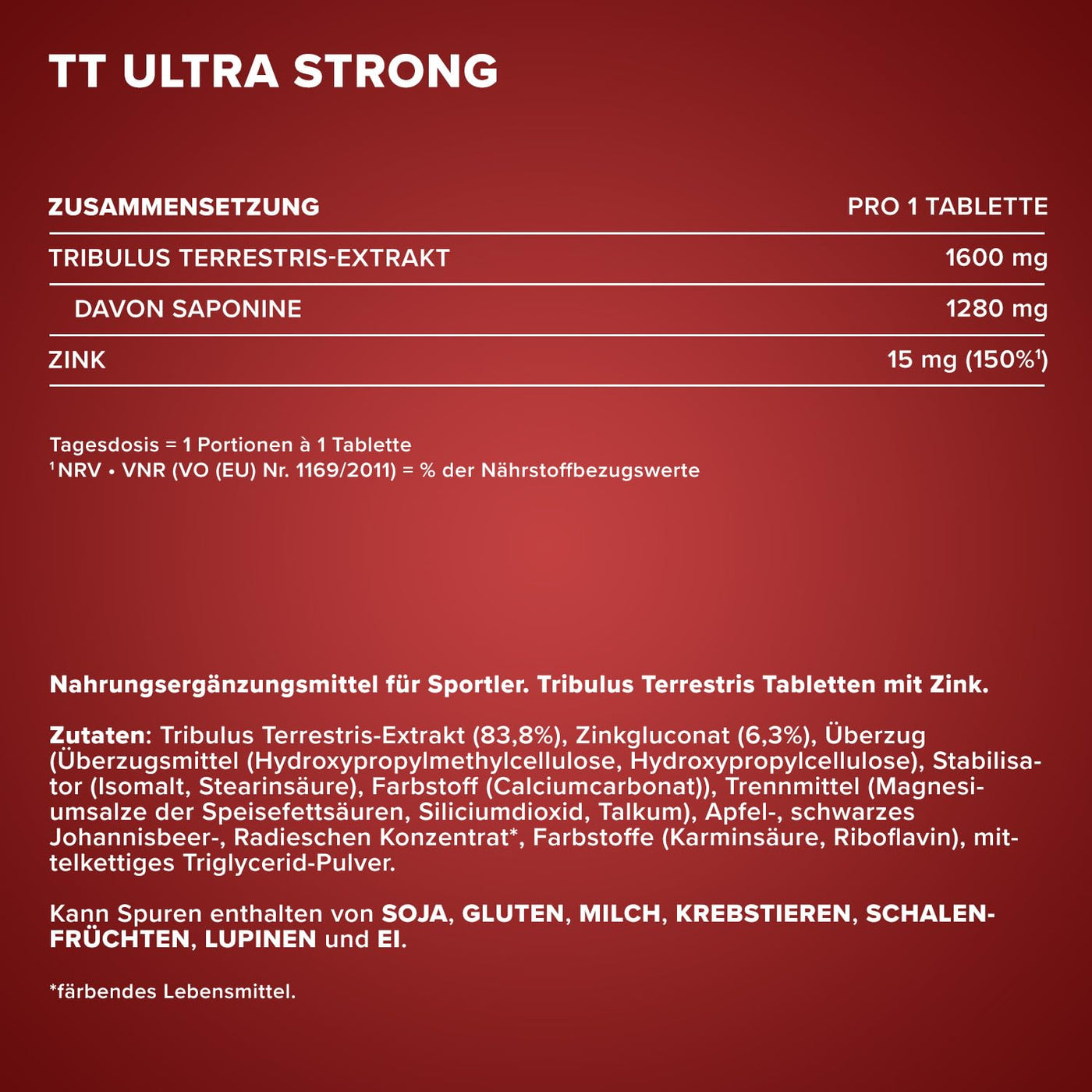 - STRONG COMPOSITION: In addition to 1600mg of Tribulus Terrestris extract, one tablet of TT Ultra Strong contains 1280mg of the secondary plant substance saponin, as well as 15mg of zinc