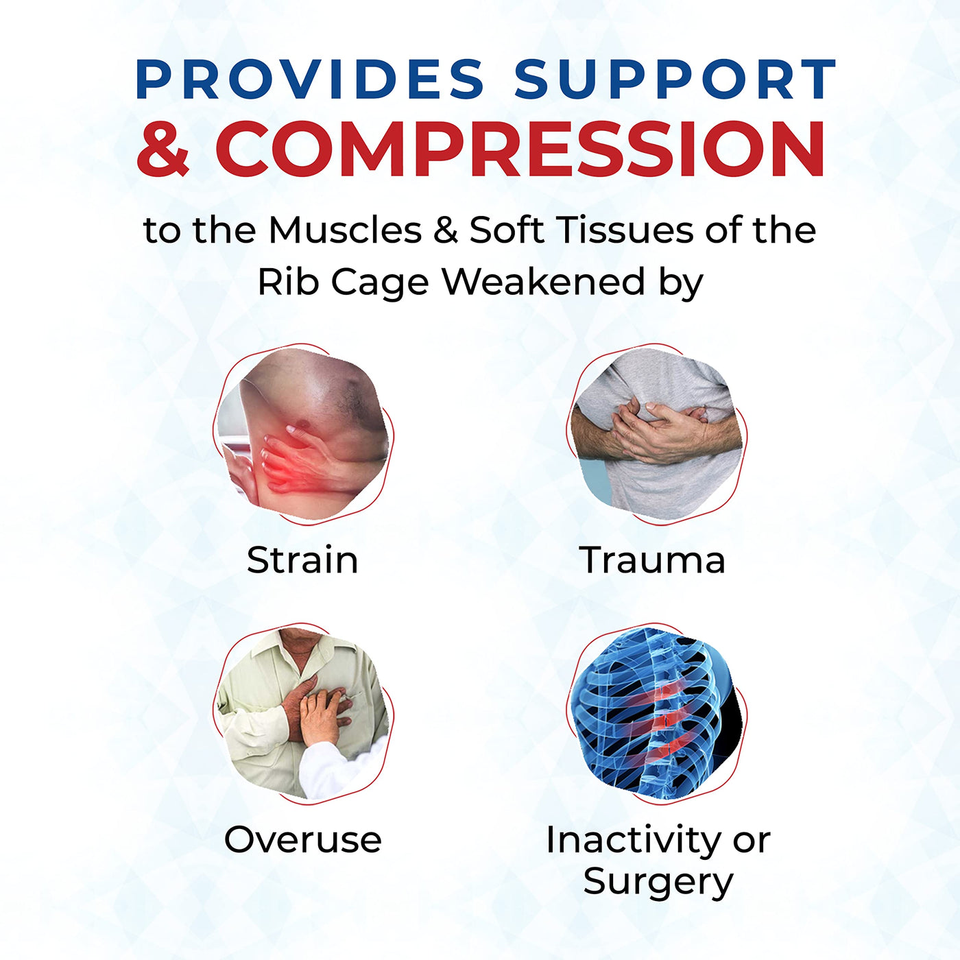 - RIB CAGE SUPPORT AND COMPRESSION: Provides support and compression to the muscles and soft tissues of the rib cage weakened by strain, trauma, overuse, inactivity or surgery.
