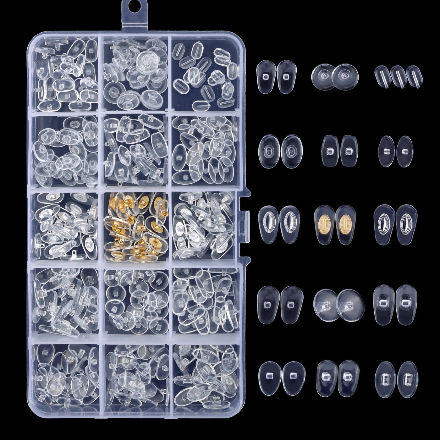 - The eye glasses repair tools set includes 33 styles of micro screws, nuts, washers and nose pads. Almost all types of accessories are here.