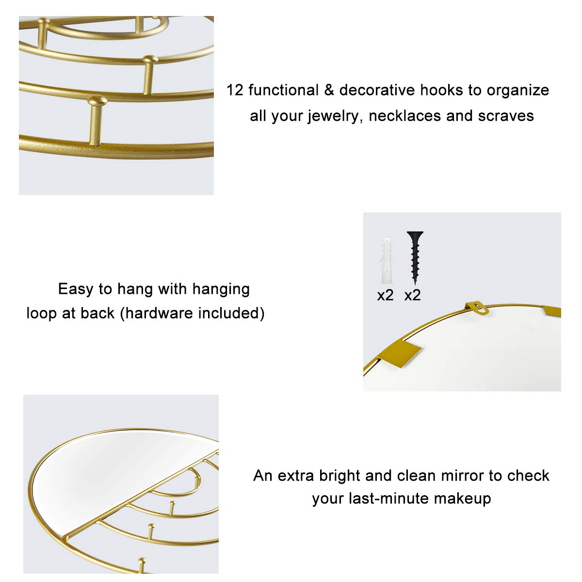 • EASY TO HANG: Diameter of the round jewelry organizer: 11.75, it has 2 screw holes on the backside and comes with hardware, so you can easily hang it up.