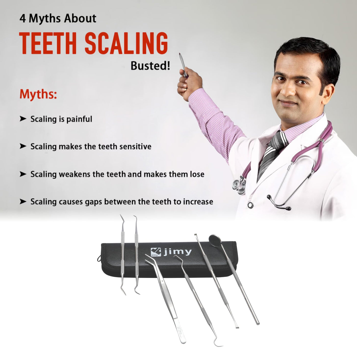 Maintain optimal oral hygiene with the Jimy 6-Piece Dental Cleaning Kit, designed for effective plaque and tarter remover for teeth. Made from premium stainless steel, these professional-grade tools are rust-resistant, durable, and easy to sanitize. Whether you're a dentist or simply want to enhance your personal dental care routine, this set offers reliable tools for every need. Each tool in scaler dental tool is made with precise angles to access hard-to- reach areas of the mouth. The included mouth mirror in dental cleaning tools ensures you can thoroughly examine and clean tough spots, helping you remove tartar, stains, and food debris effortlessly. This dentist kit is also designed with comfort in mind. The non-slip handles ensure better control during use, reducing the chance of slipping and improving the accuracy of each cleaning session. Regular use of tooth scraper plaque tartar remover can help prevent plaque buildup, eliminate bad breath, and give you a bright, confident smile. Packaged in a sleek, portable box, this dental kit oral care tools are perfect for travel and stays organized wherever you go. Suitable for all ages and even pets, it makes an excellent gift for friends, family, or dental professionals. Keep your smile healthy and radiant with the Jimy Dental Tools Set.