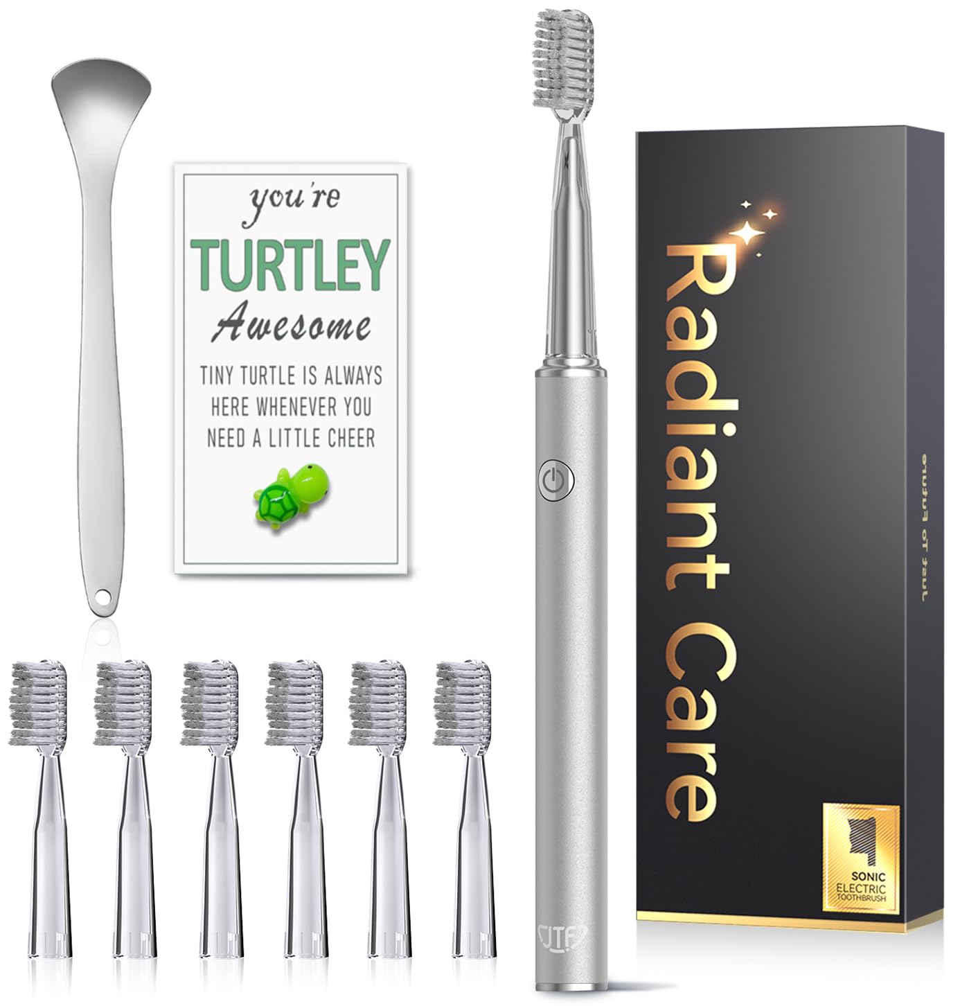 - [What Will You Get] 1 x JTF Sonic Electric Toothbrush, 6 x Brush Heads, 1 x USB-DC Charger Cable (adapter not included, suitable for 5V charging adapters), 1 x Tongue Scraper, 1 x Small Turtle (random color), 1 x User's Manual, 2-Year Product Warranty. If you need any support, please contact us and we will respond within 24 hours.