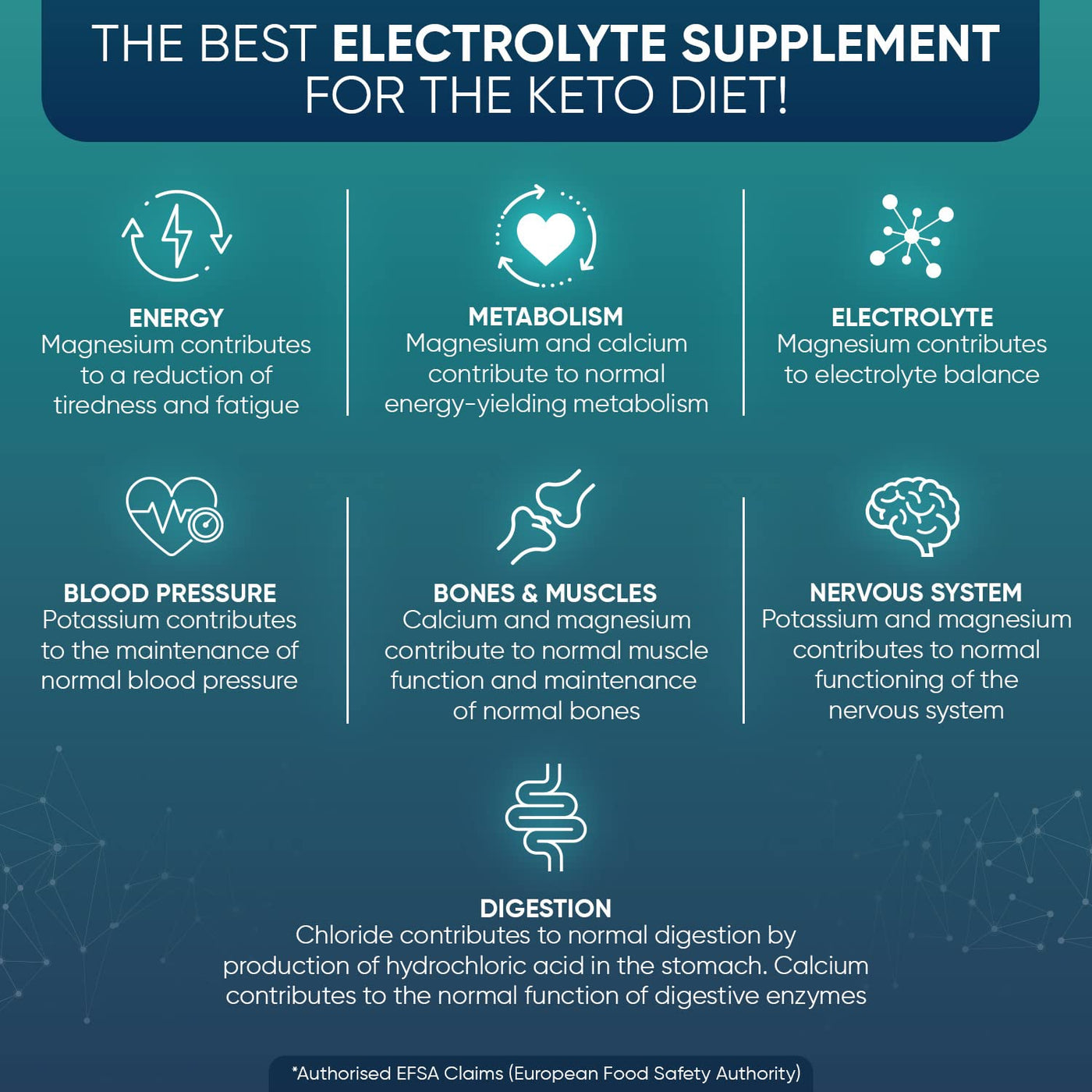 - Benefits of Our Mineral Rich Keto Supplement - Electrolytes play a crucial role in muscle contractions and help balance the amount of water & pH level in the body. The added ingredients Sodium & Chloride contribute to normal digestion by producing hydrochloric acid in the stomach. Magnesium and Calcium contribute to the normal energy yielding metabolism. Magnesium also contributes to a reduction of tiredness &fatigue(EFSA approved).