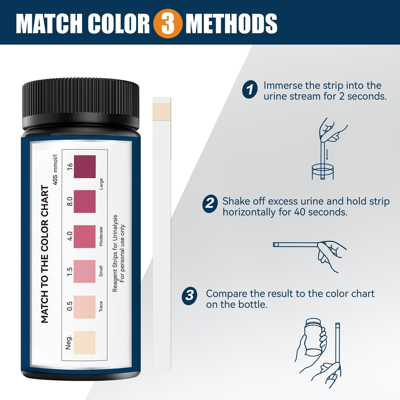 - EASY&FAST&Reliable: Just dip the ketone test strips into the urine test sample, then wait for color changed and match your results with the color chart.