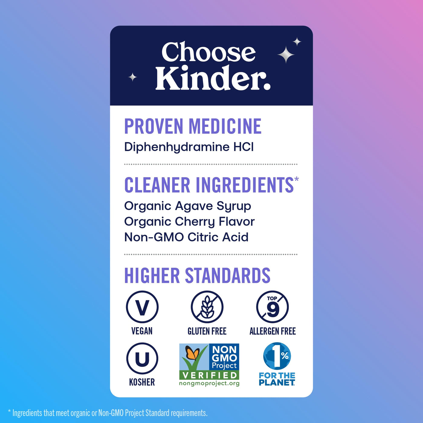 - DOCTOR-FORMULATED AND KID-APPROVED KinderMed Kids Allergy is doctor- formulated with only 5 ingredients including organic cherry flavor, and its Non-GMO Project Verified, vegan, gluten-free, kosher, and free from the top 9 major food allergens.