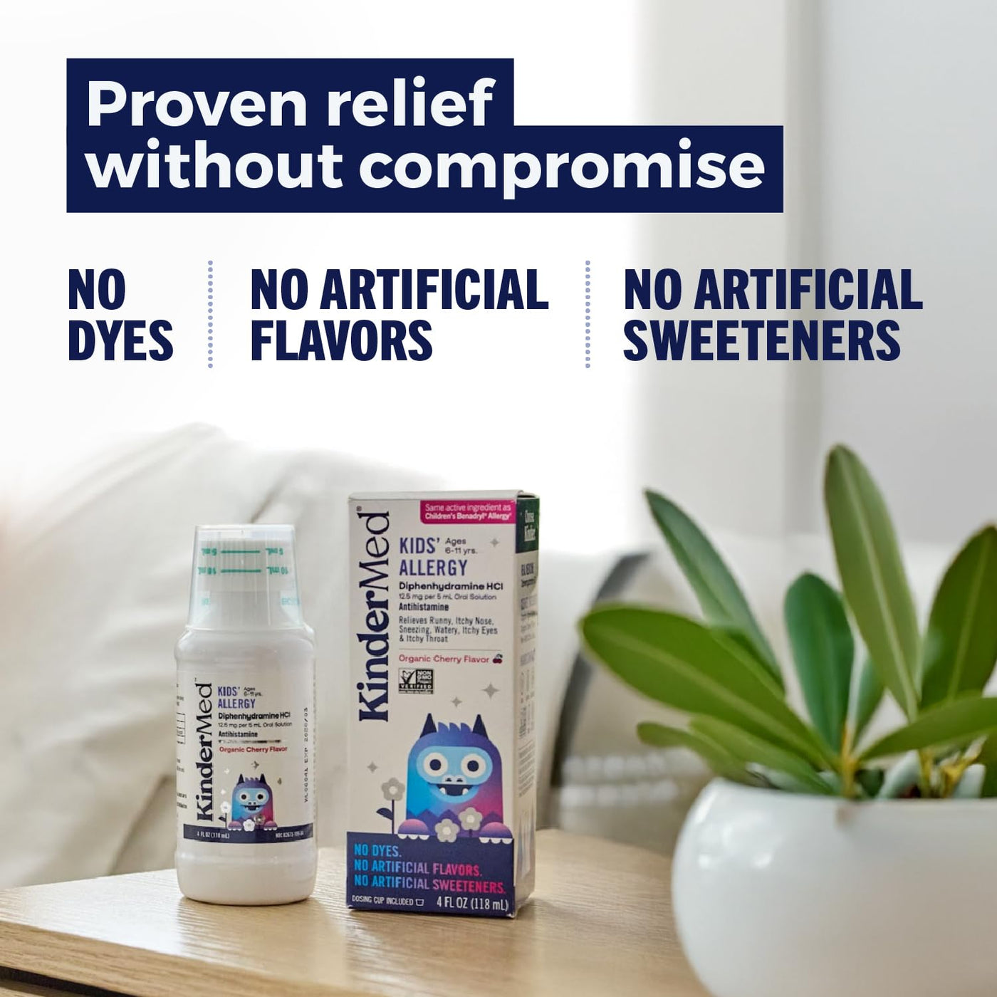 - REAL MEDICINE, KINDER INGREDIENTS KinderMed Kids Allergy is made with the same effective, active ingredient (diphenhydramine HCl) as the leading brand without dyes, parabens, artificial sweeteners or flavors, so you can trust it to provide safe and effective relief for your child.