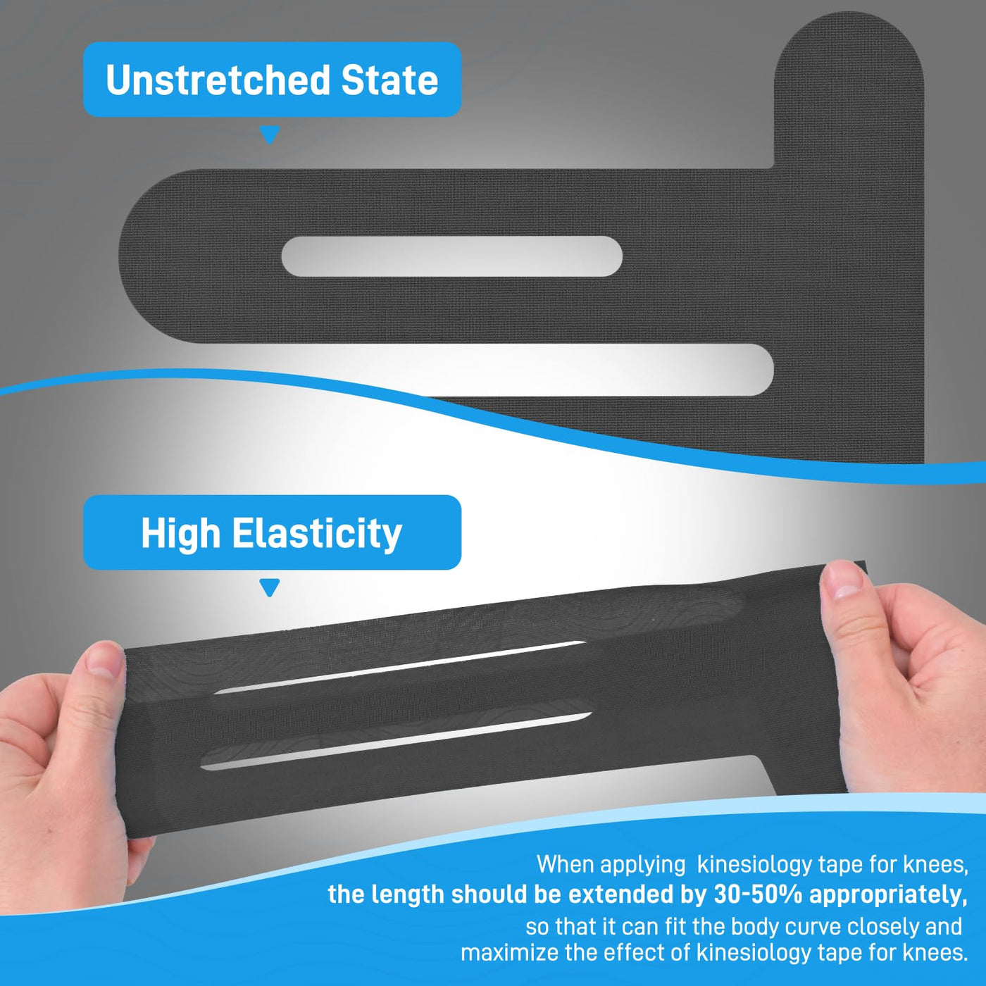 - Increase Support, Strengthen and Stabilize the Knee JointKinesiology tape for knees is a functional muscle tape designed for various sports, especially for outdoor sports. Knee tape is mainly used to increase support, strengthen and stabilize the knee joint, improve incorrect movement patterns, effectively limit the range of motion of athletes' joints and muscles, prevent muscle strain, and relieve pain that may occur during exercise.(10pcs Black)