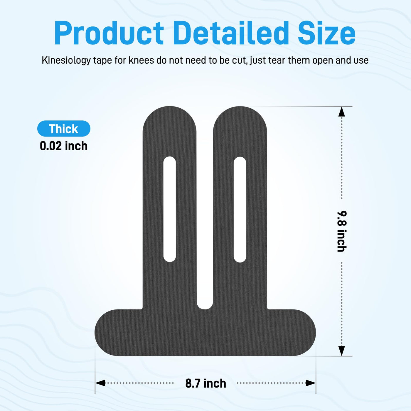 - Pre-cut for the Knee AreaThe pre-cut kinesiology tape for knee is designed for the knee area. The shape and size are suitable for the anatomical structure of the knee. No additional cutting is required and just stick it on and it can be used. The adhesive part of the knee kinesiology tape adopts a partitioned peeling design to save athletes' precious time.