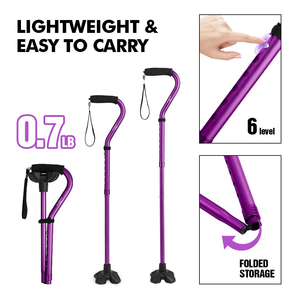 • SLIP RESISTANT - Anti-marking rubber tip prevents falls and keeps you safe. The pivoting quadruple treaded base provides better traction and supports your full weight while giving you the flexibility to walk, run and turn easily. The sturdy wristband can prevent slip-and-fall accidents when used, and provide convenience when folded and stored. With a 250 pound weight capacity, this sturdy cane will support you throughout your daily life.