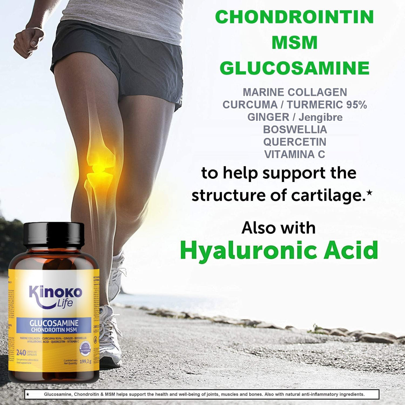 Kinoko life Glucosamine and Chondroitin - 240 capsules with MSM, marine collagen, hyaluronic acid, turmeric, black pepper, ginger, boswellia and quercetin. For joints, cartilage and bones
