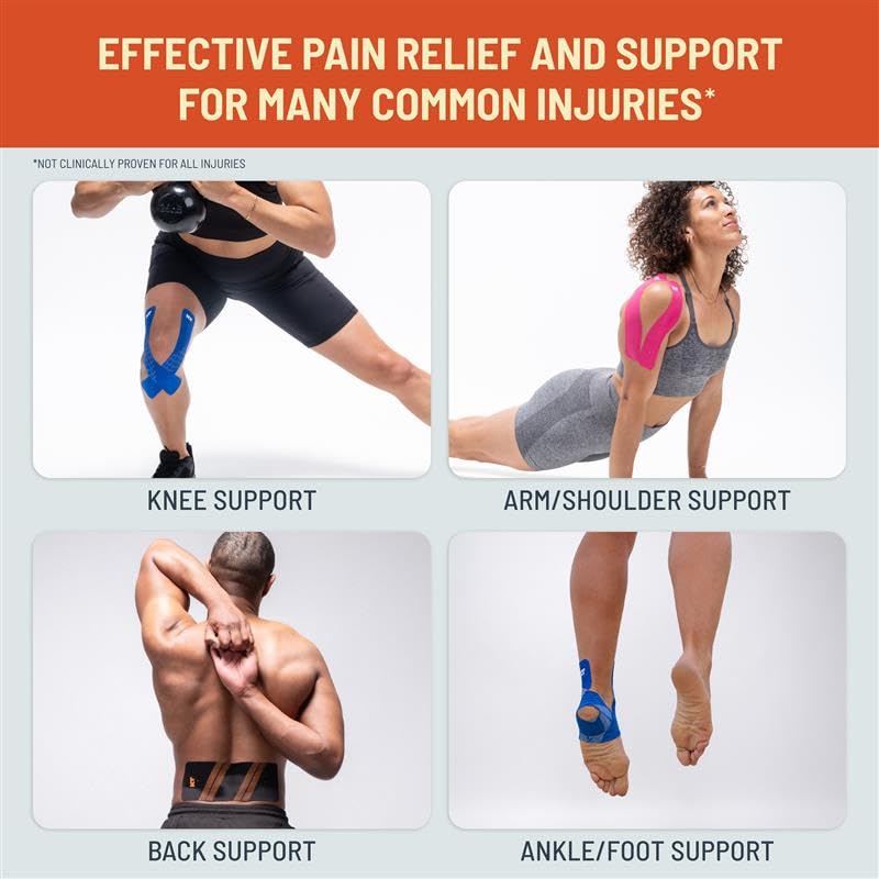 - Versatile application: Easily self-apply KT Tape for back, knee and shoulder pain, plantar fasciitis, tennis elbow and more; Cut strips into smaller widths or lengths when you need a more personalized fit; Apply correctly with the KT App!