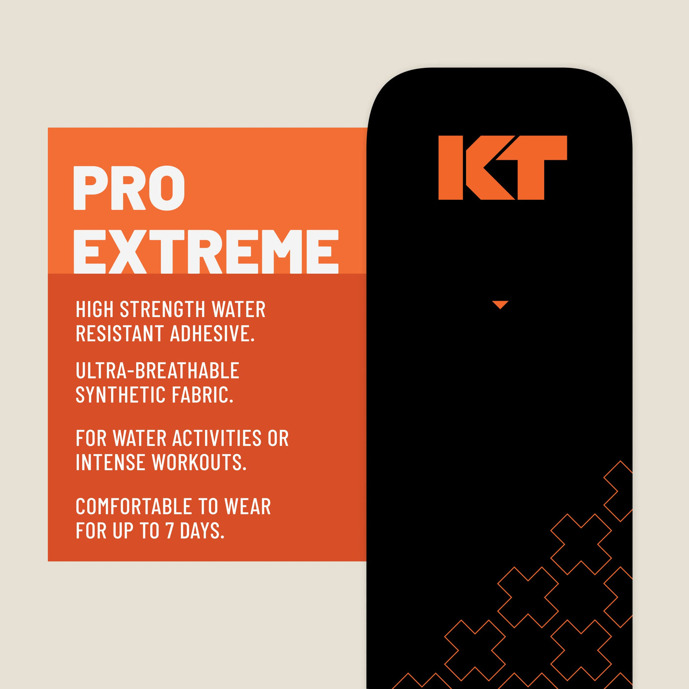 Need support that will endure your toughest workout? KT Tape Pro Extreme is here for you. The extra-strength adhesive within KT Tape Pro Extreme is specially formulated to help with adhesion during strenuous activity through extreme conditions including wet conditions, high heat, high humidity, or oily skin. It has been designed to relieve pain and provide support where you need it, staying in place through multiple workouts. KT Tape Pro Extreme can be worn in the shower, in the pool, or while riding waves at the beach. Synthetic performance fibers are fast-drying, water resistant, and provide superior strength, stretch, and recoil. KT Tape Pro Extreme also features an extra- strength adhesive that will remain in place for 4-7 days. KT Tape Pro fibers feature a stronger elastic core which delivers better support for muscles, joints and tendons without restricting comfort and range of motion. This improved elastic core retains its elasticity far better over time and provides more durable support than cotton kinesiology tape, lasting as long as you need it. Like top athletes, it relies on both strength and endurance to get the job done. KT Tape Pro Extreme is pre-cut and ready to apply right out of the box. Pre-cut strips have rounded corners which help to prevent the corners from catching on clothing or the edges fraying. Each roll contains 20 pre-cut strips that are 10 inches long and 2 inches wide. KT Tape products are Hypoallergenic, Latex-Free, Natural Rubber-Free! This means that our products have been designed and developed to contain fewer potential substances that can trigger allergic reactions. While our goal is to provide you products that won't cause any irritations, if you are known to have sensitive skin or prone to irritation, we recommend testing a small piece of KT Tape applied with no stretch on tougher skin such as the knee or forearm before utilizing our product line. NOT CLINICALLY PROVEN FOR ALL INJURIES Extra-strength adhesive can outlast the most extreme conditions including showers, sweaty workouts, and even the pool or ocean Versatile pre-cut strips can be applied to target pain Stronger elastic core within KT Tape Pro Extreme ensures longer-lasting benefits of pain relief and support Latex-free, hypoallergenic, and natural rubber-free Each box includes: 20 precut strips of 100% synthetic tape with extra-strength adhesive One hard plastic carrying case with twist on lids to keep your tape in good shape in your gym bag or purse One Quick Start Guide with step-by-step instructions for the most common areas of use