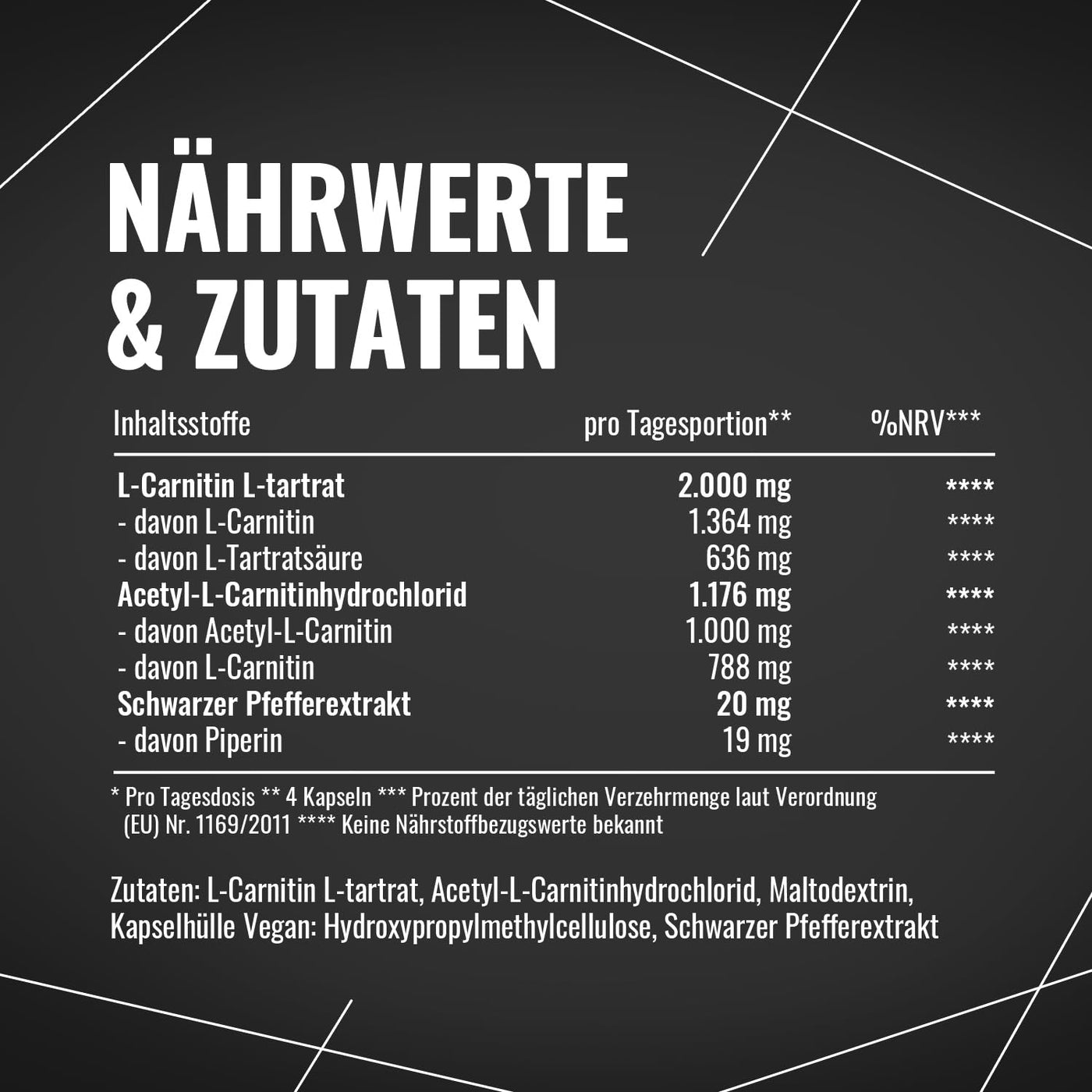 - TRIPLE COMPLEX: Here you get the full load of carnitine. Our highly innovative complex consists of L-carnitine tartrate, acetyl-L-carnitine and black pepper