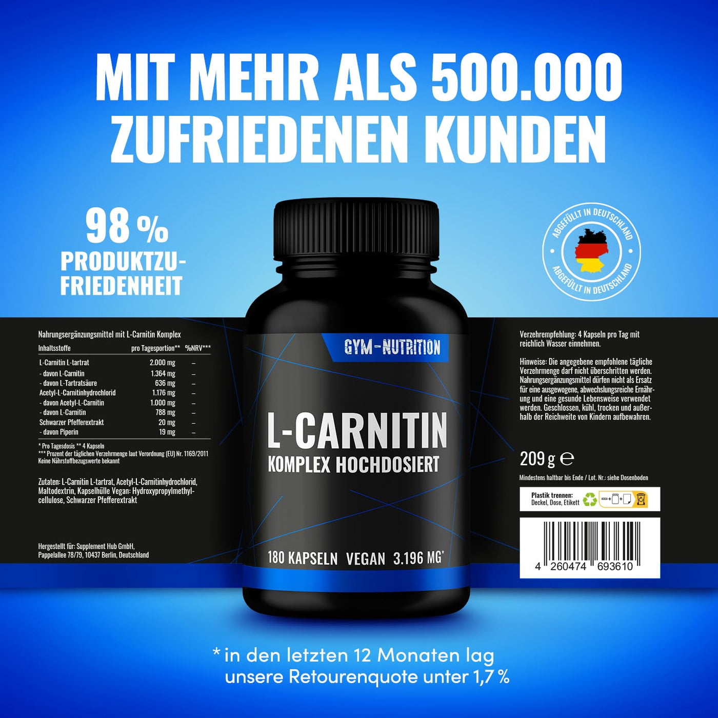 - VEGAN & WITHOUT UNWANTED ADDITIVES: The Gym Nutrition L Carnitine is 100% vega, as well as free from magnesium stearate, flavors, dyes, stabilizers, gelatin & Of course also without preservatives. The high-dose L carnitine capsules from Gym-Nutrition are very popular with athletes.