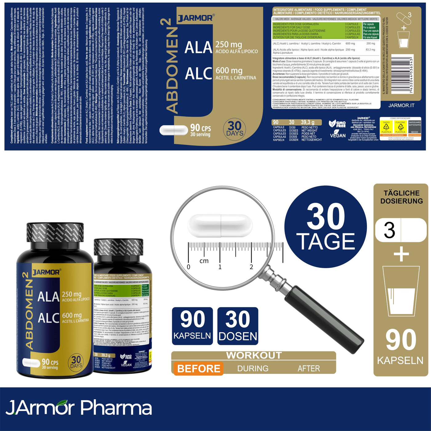 L-Carnitine 600 mg + Alpha Lipoic Acid Capsules High Dose - 90 Capsules - Acetyl l Premium Quality & Laboratory tested - Pure L-Carnitine Tartrate - Most stable form of L Carnitine J.Armor Pharma Italy