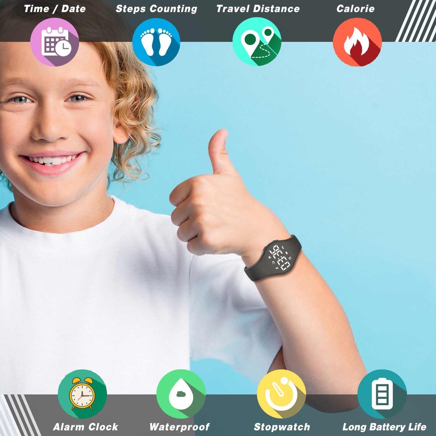 LED Children Digital Pedometer Watch, Waterproof Sport Wristwatch, with Step Counter, Calories, Calendar for Kids Boys Girls Black