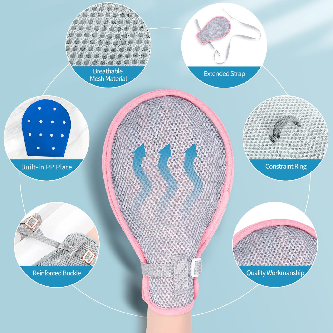 - Upgraded design, featuring a highly breathable mesh surface to provide comfortable hand restraint, long-term use will not cause patient irritability, and will not cause resistance due to feeling stuffy.
